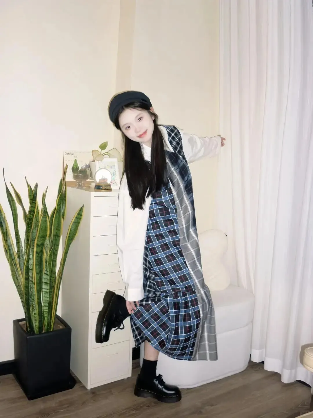 首先我们要解决的是穿搭问题,很多姐妹在家里拍照随便穿件睡衣,这样肯定不出片。看看图中的搭配,白色衬衫作为打底,干净清爽,外面叠穿一件蓝色的格子马甲,瞬间增加了层次感。下半身是同色系的格子长裙,这种套装式的穿搭最不容易出错,而且纵向的线条感能在视觉上拉长身形。头上搭配一顶黑色的贝雷帽,这是提升精致度的关键单品,能让整个造型看起来更加完整。脚上的黑色厚底鞋搭配中筒袜,不仅显高,还能修饰小腿线条。所以 穿搭要有层次感,同色系搭配最显高显瘦 ,这是居家拍照不显随意的第一步。