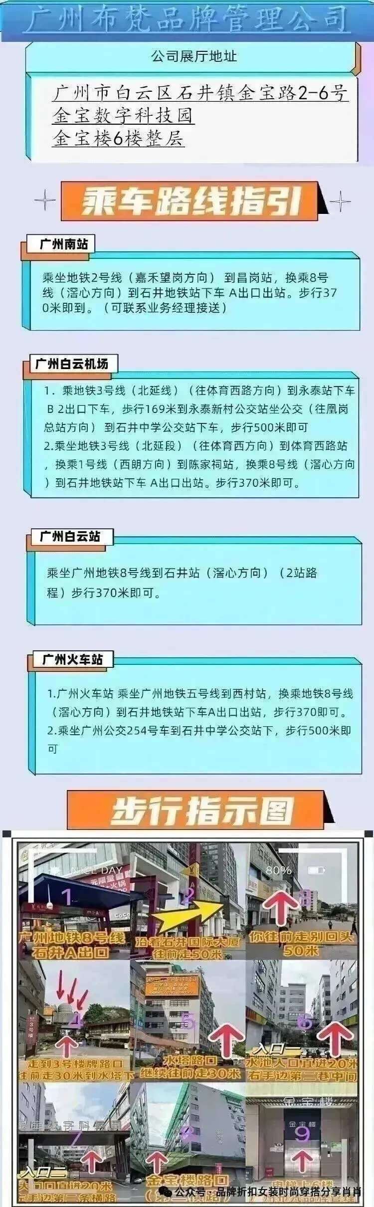 公司地址:广州白云区石井镇,石井街,石井中学公交车站后面(即石井国际后面)金宝路,金宝路服装中心B3栋6楼[本公司有3000平方米展厅仓库,常年有数十个广州、深圳、上海、杭州等地的知名女装品牌供应,欢迎前来公司参观考察,现场看货]