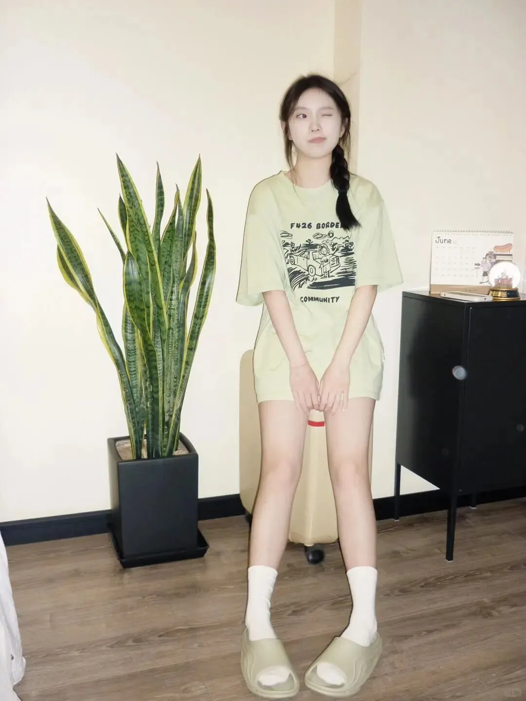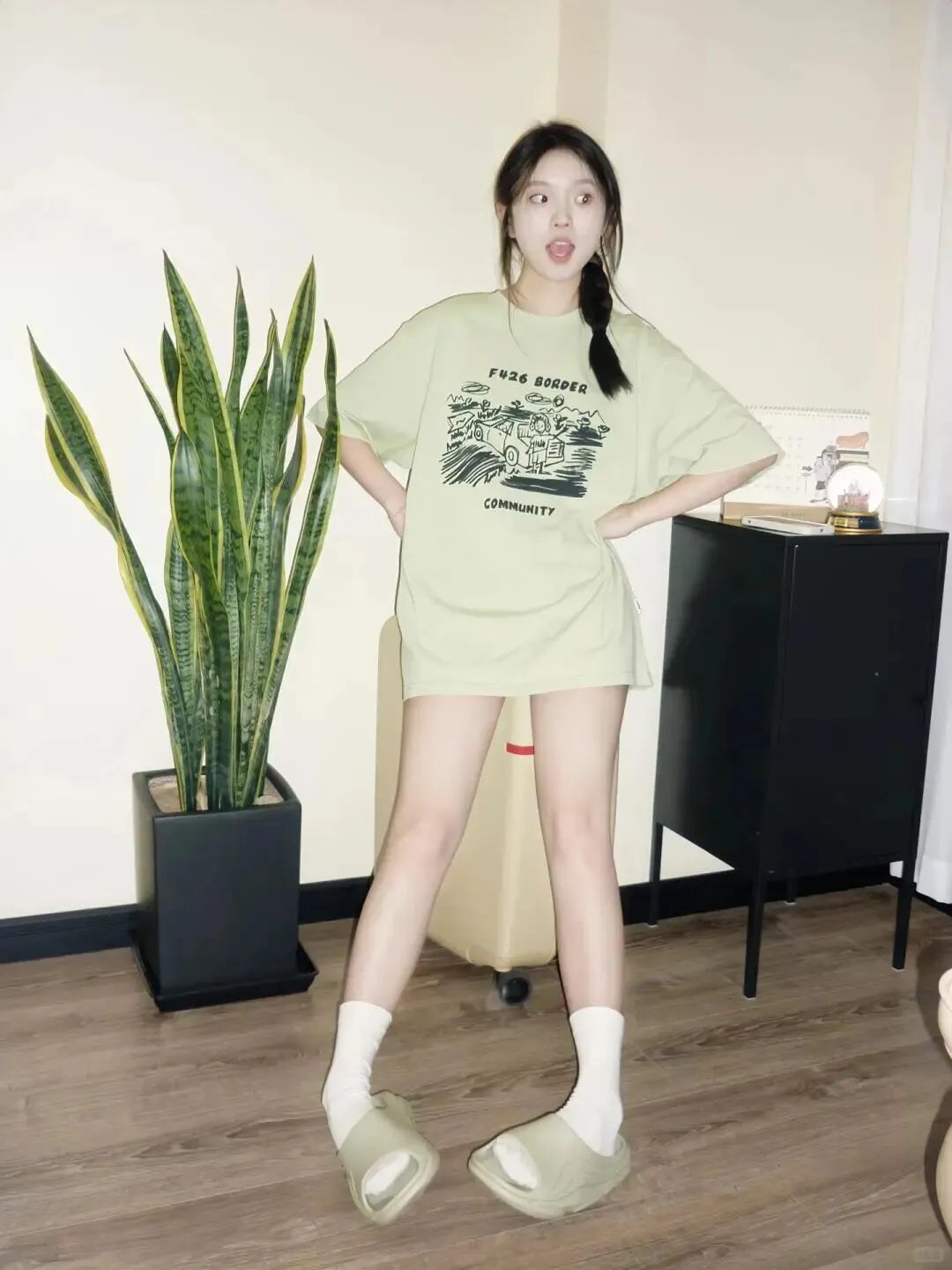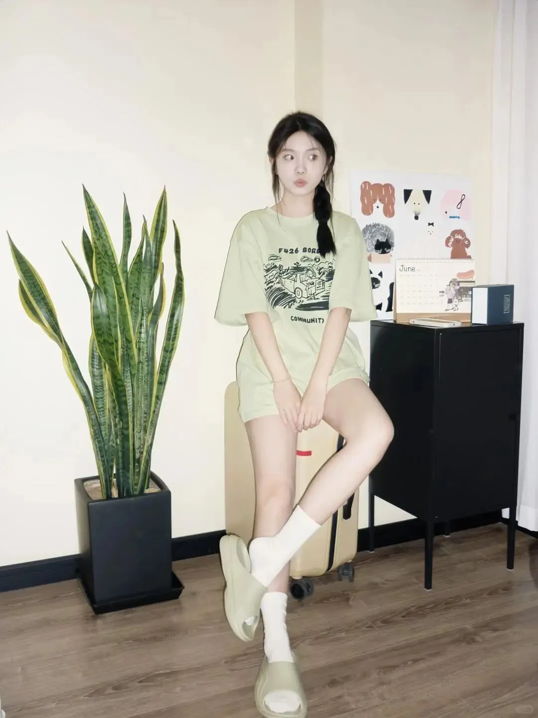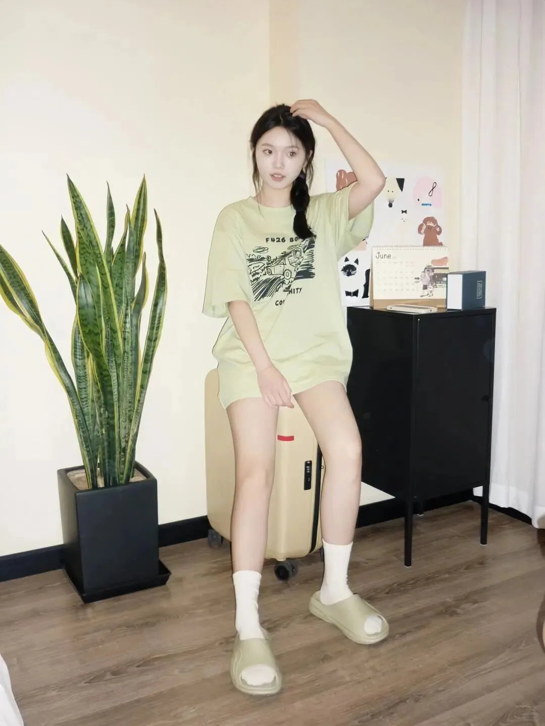 穿搭也是居家写真出片的关键。夏天最适合的就是清爽色系,比如这种浅绿色的套装,给人一种视觉降温的感觉。 Oversize 的 T 恤搭配短裤,既遮肉又显得随性。 选择低饱和度色系穿搭,衬托肤色白皙,营造夏日清新感 。不要穿得太紧身,适当的宽松感更能衬托出身体的纤细,那种慵懒的居家氛围正是通过宽松的衣物来体现的。搭配一双白色的袜子和同色系的拖鞋,细节上的呼应会让整体造型看起来更完整,精致度瞬间提升。