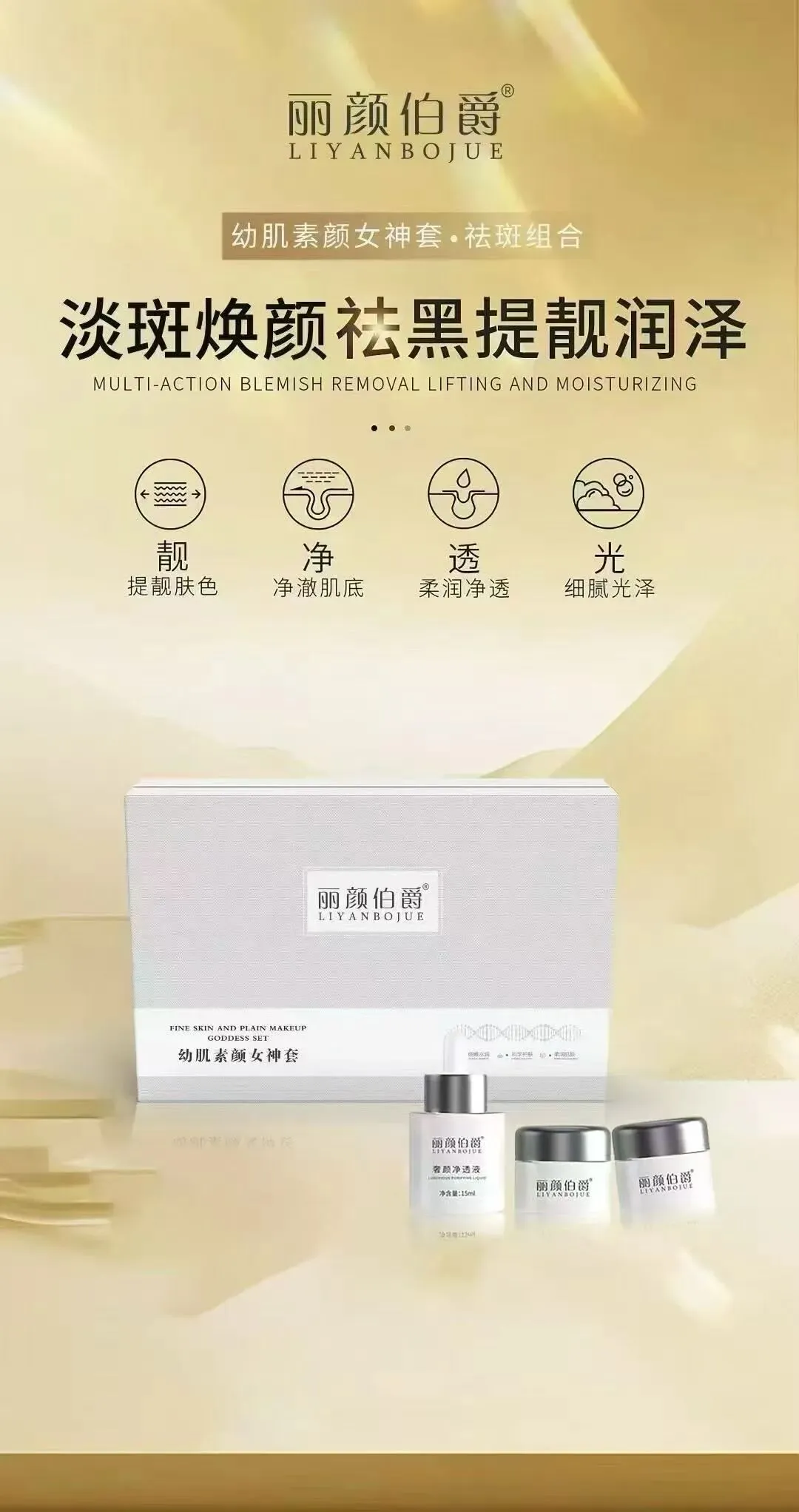 丽颜伯爵幼肌素颜女神套主打淡斑焕颜、祛黑提靓,通过多维度协同作用,实现肌肤从暗沉色斑到匀净透亮的转变,打造 “靓、净、透、光” 的健康美肌。
