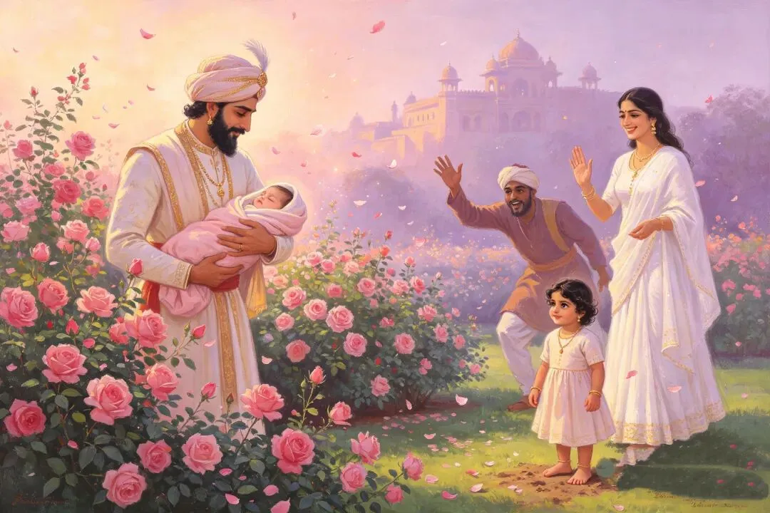 斋浦尔王族的辛格大君,在玫瑰园里抱起他刚出生的女儿。三千公顷土地、十七座宫殿的继承人,此刻只是他掌心一团温热的呼吸。