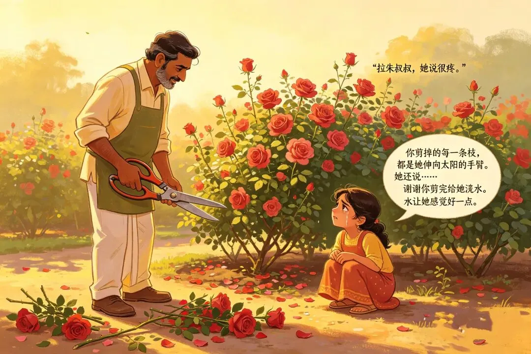 园丁拉朱正用大剪刀修剪玫瑰侧枝。咔嚓作响,枝条纷落。突然,花丛里站起一个小小的身影——拉克希米蹲在那里一整个早晨,谁都没发现。