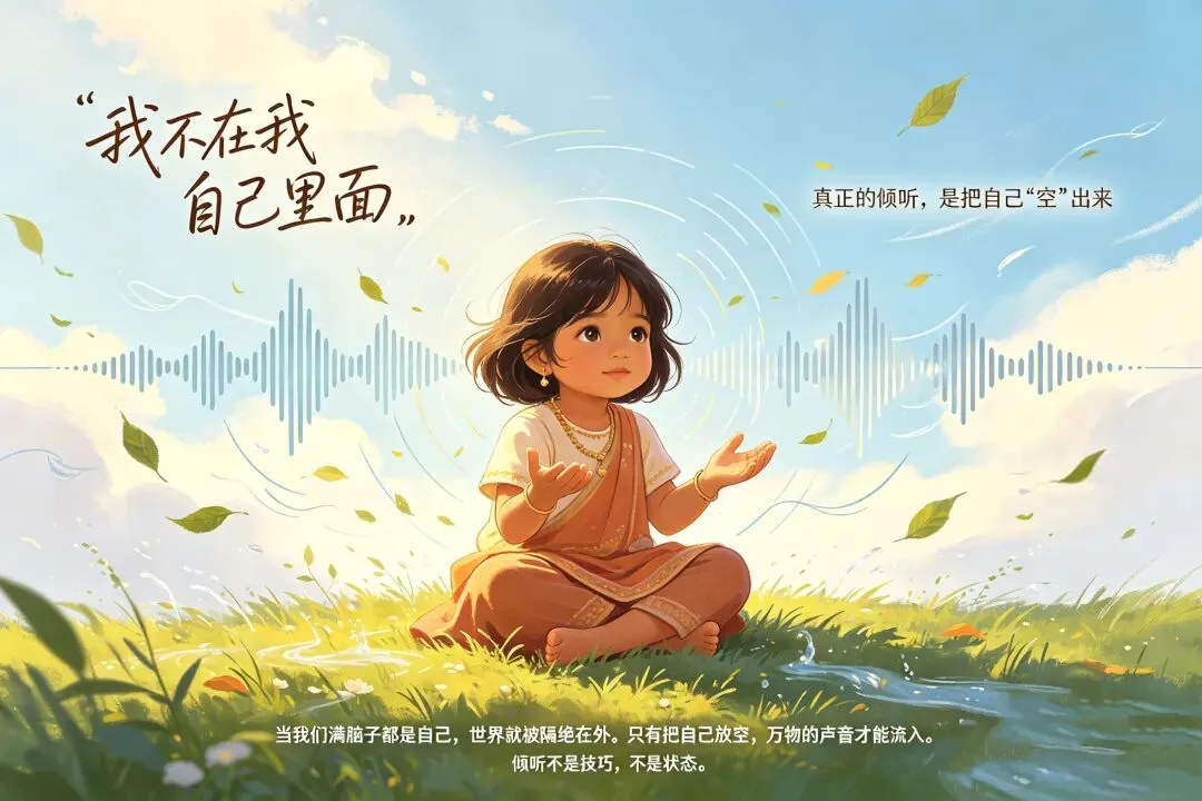 三岁的拉克希米说“我不在我自己里面”——这句话藏着一切深度连接的秘密。当我们满脑子都是自己,世界就被隔绝在外。只有把自己放空,万物的声音才能流入。倾听不是技巧,是状态。