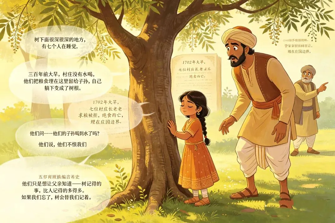 辛格大君冲回书房,翻出家族编年史。一段几乎被遗忘的记载赫然在目:1702年大旱,七位村庄长老求粮被拒,绝食而亡,埋在庄园边界。