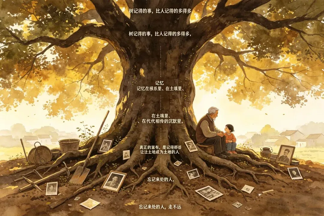我们以为记忆在头脑里,其实记忆在根系里、在土壤里、在代代相传的沉默里。真正的富有,不是拥有多少土地,是记得那些让土地成为土地的人。忘记来处的人,走不远。