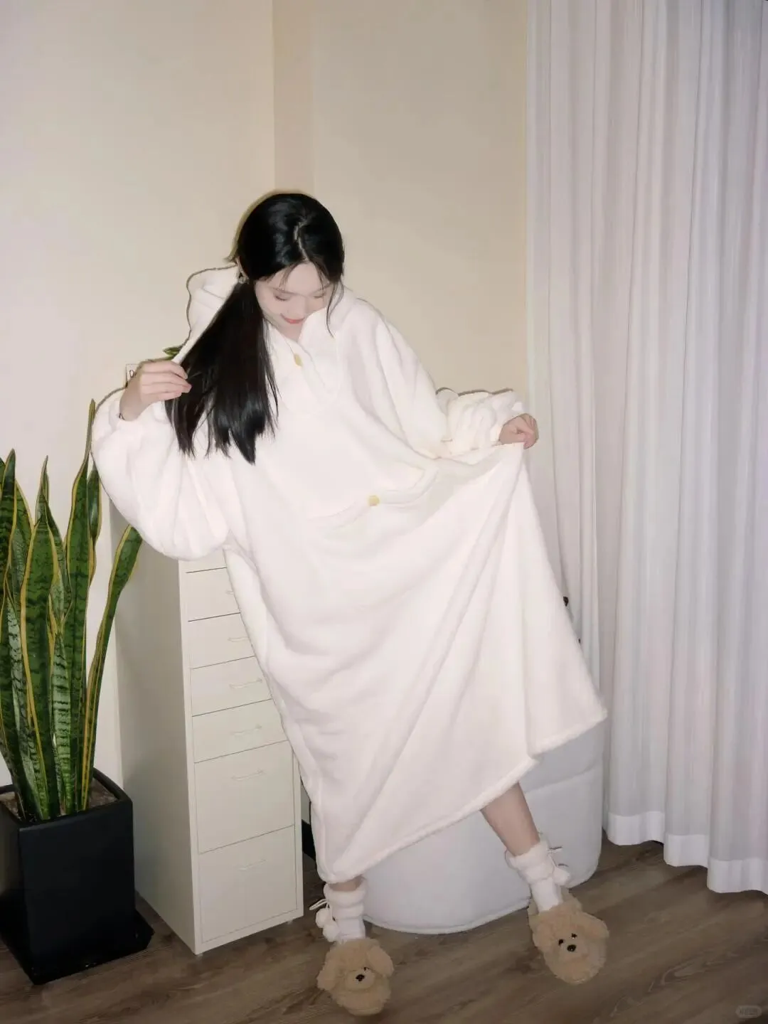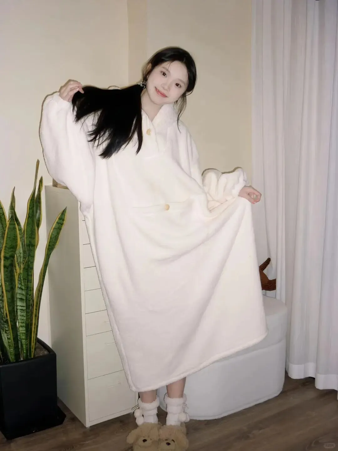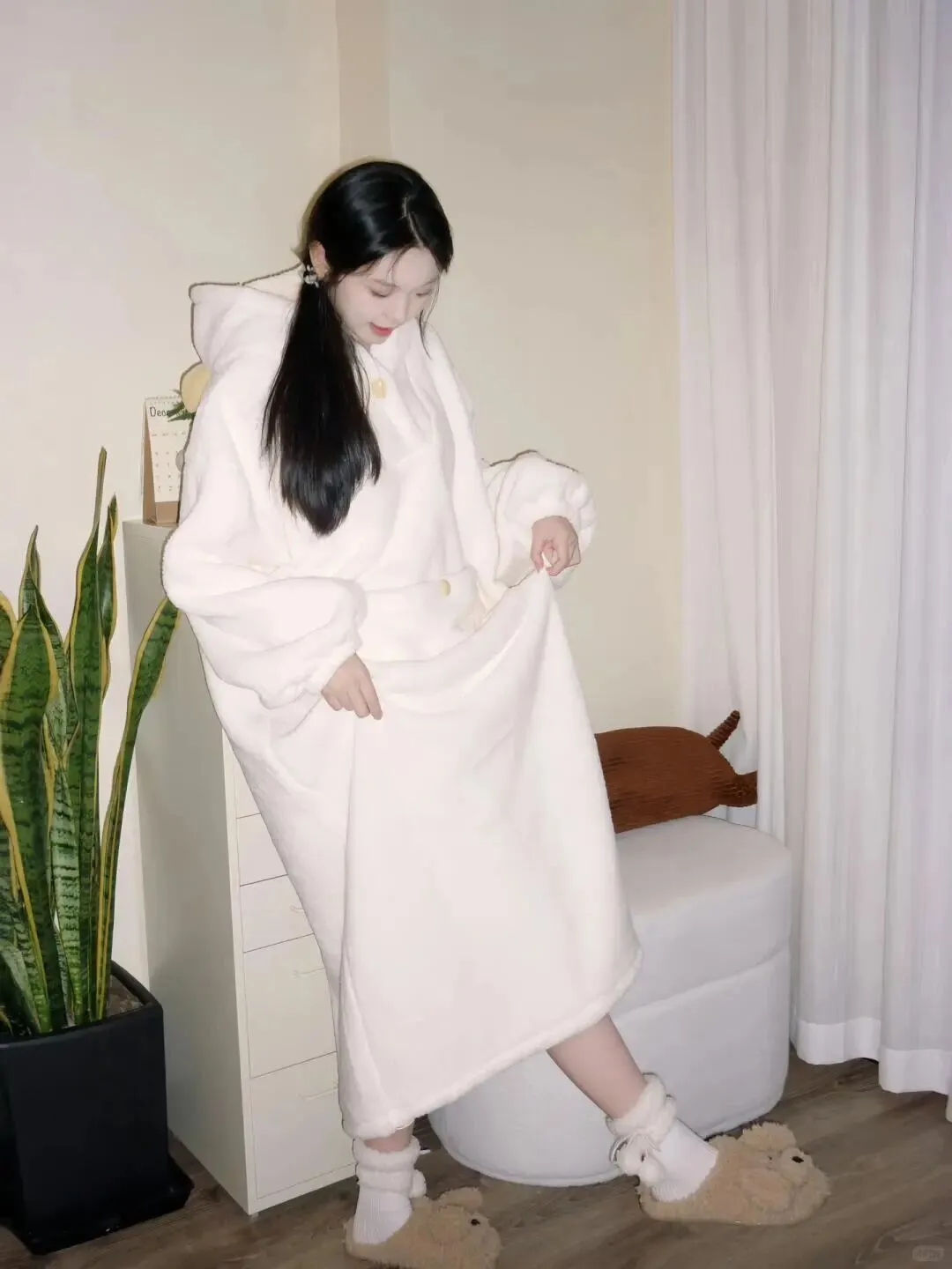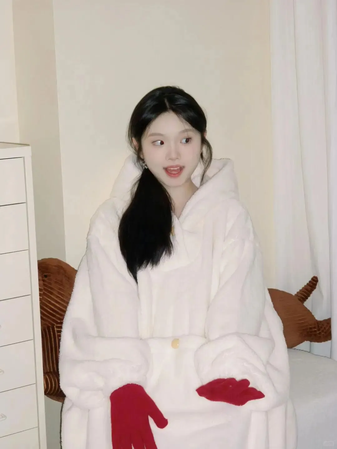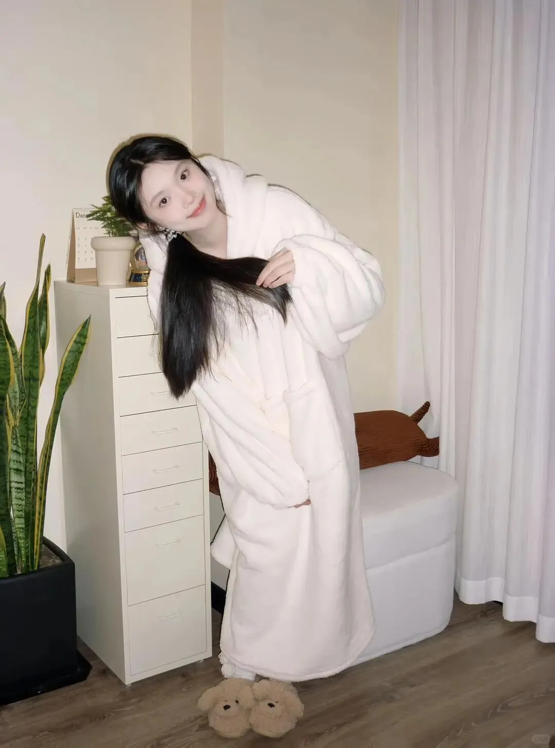 就像图片里这样,一件白色的宽松家居服或者睡袍,既能遮住身上的肉肉,又能营造出一种刚睡醒的慵懒感。如果是夏天,可以换成白色的吊带裙或者 Oversize 的白 T 恤,原则就是要宽松舒适,不要紧身。白色的衣服在室内光线下会显得非常柔和,配合春天的自然光,整个人都在发光。记得衣服质感要好,不要皱皱巴巴的,这样拍出来的照片才会有高级的质感。