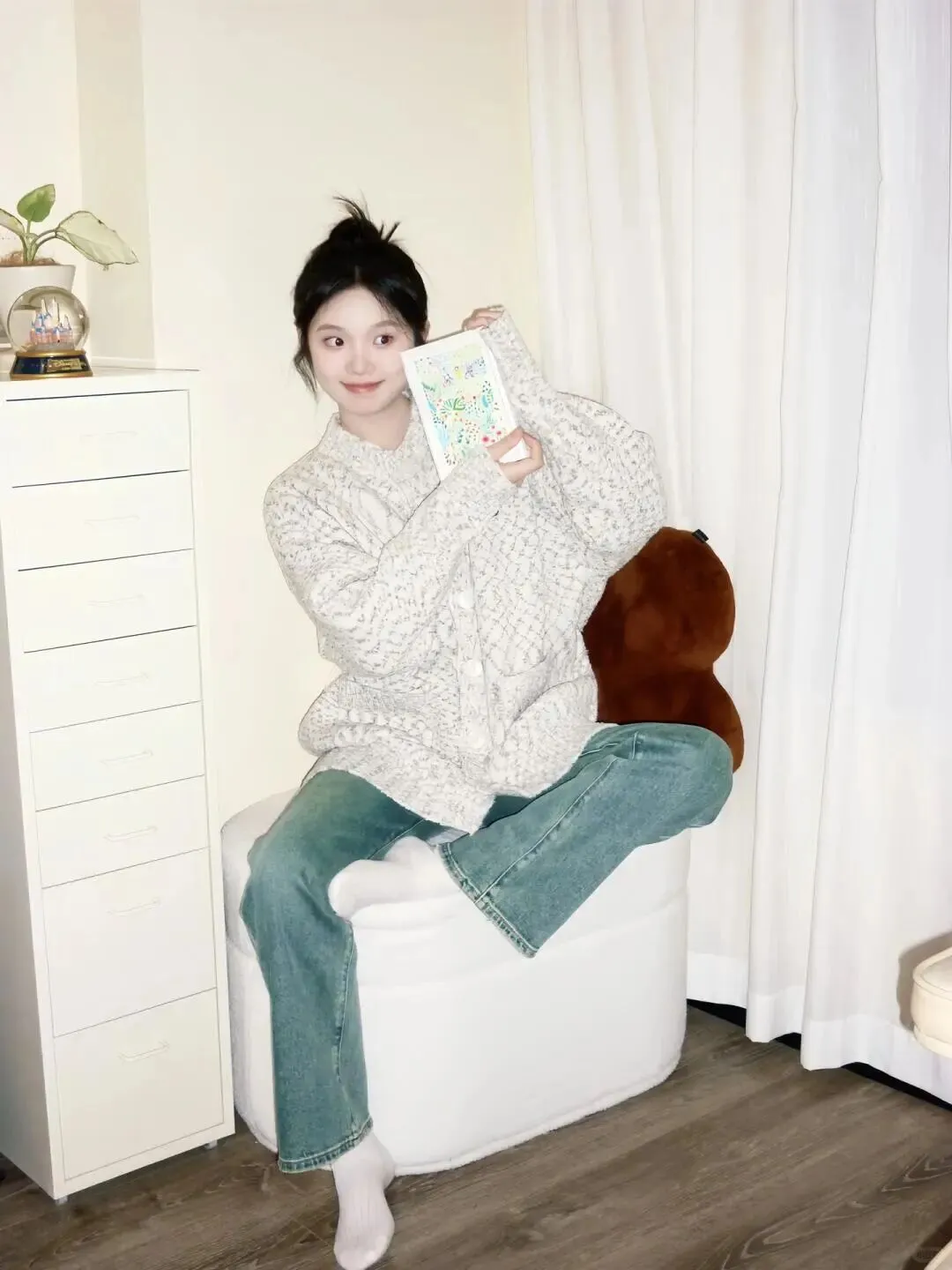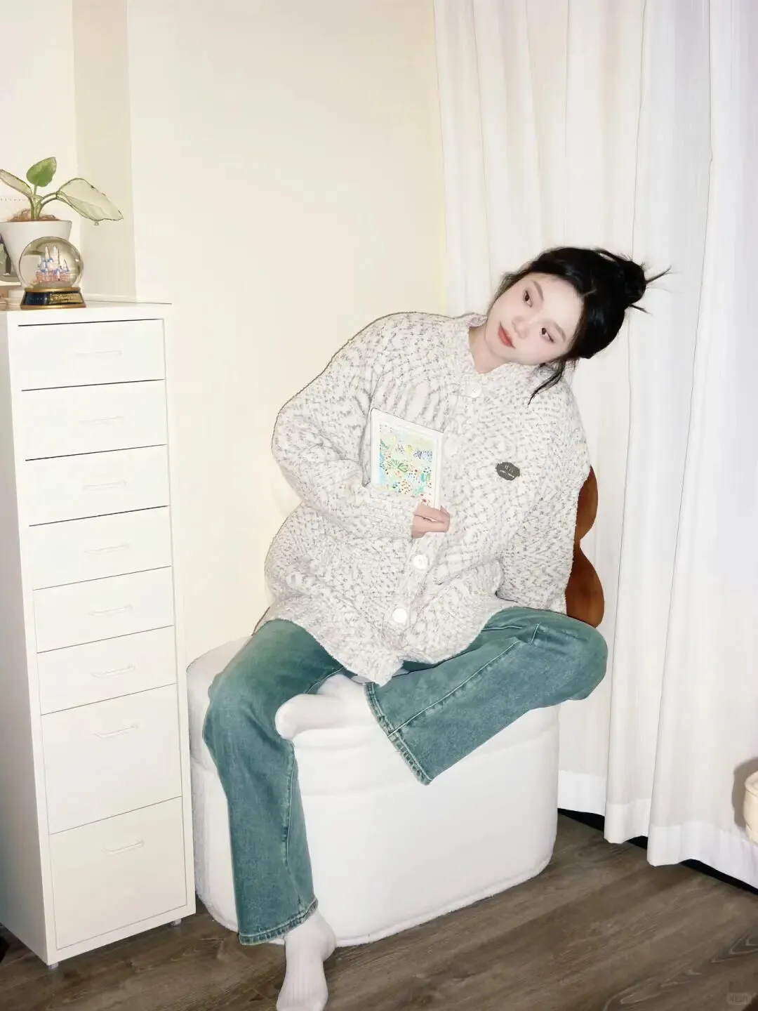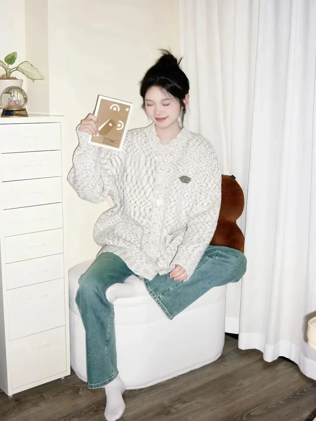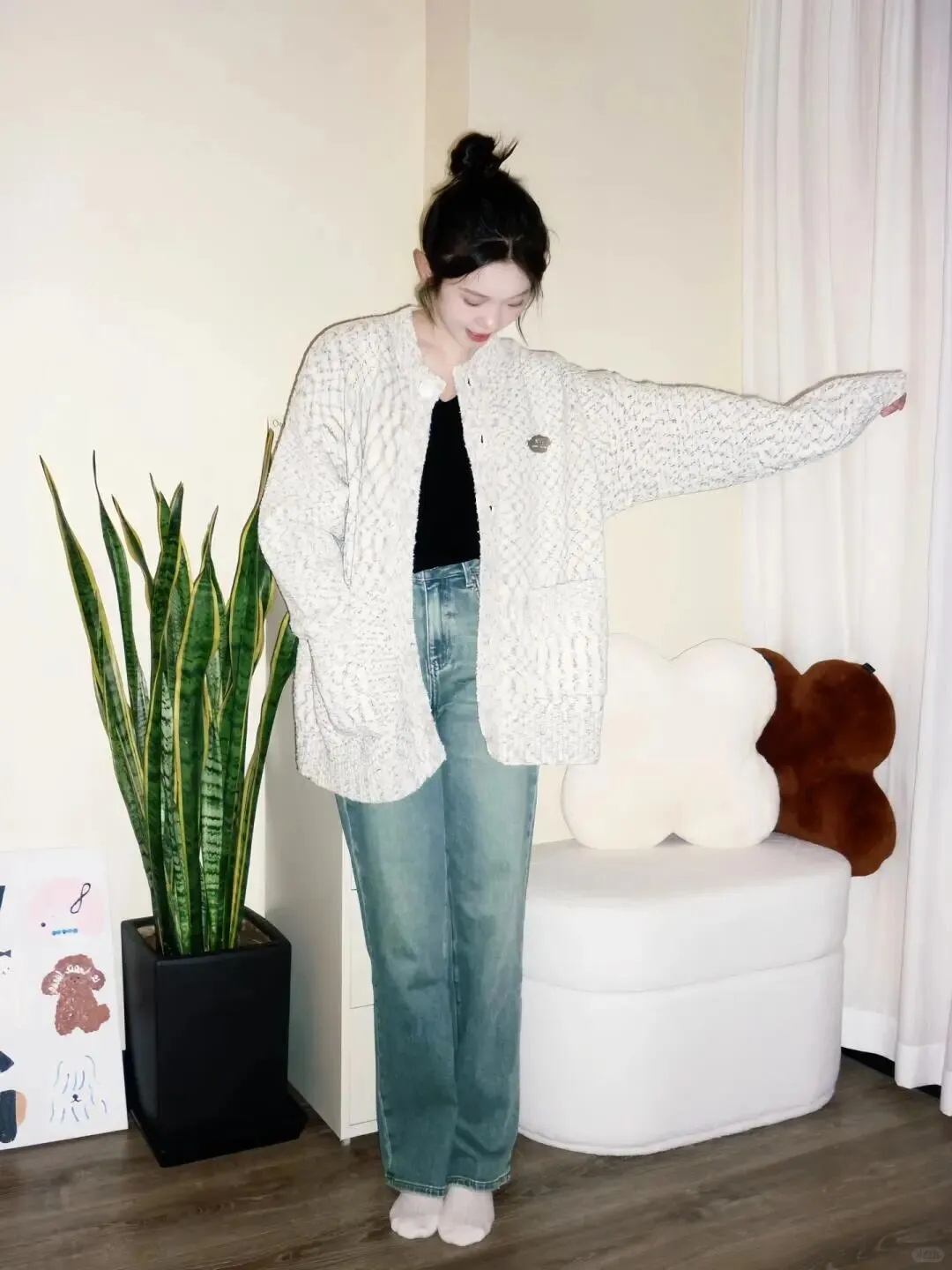 首先我们要解决的是穿搭问题,居家拍照最忌讳穿得过于正式或者颜色太杂。看看图中的模特,她选择了一件质感柔软的白色针织开衫,内搭简单的黑色打底,下身是一条复古蓝色的直筒牛仔裤。这种搭配既保留了居家的舒适度,又在色彩上形成了经典的蓝白黑组合,非常耐看。 穿搭选择:白色针织开衫搭配复古牛仔裤 这样的组合能够很好地衬托肤色,同时牛仔裤的挺括版型可以修饰腿型,让整个人看起来更加挺拔。针织衫的纹理增加了画面的细节感,不会显得单调,而黑色内搭则起到了收缩视觉的效果,显瘦又高级。