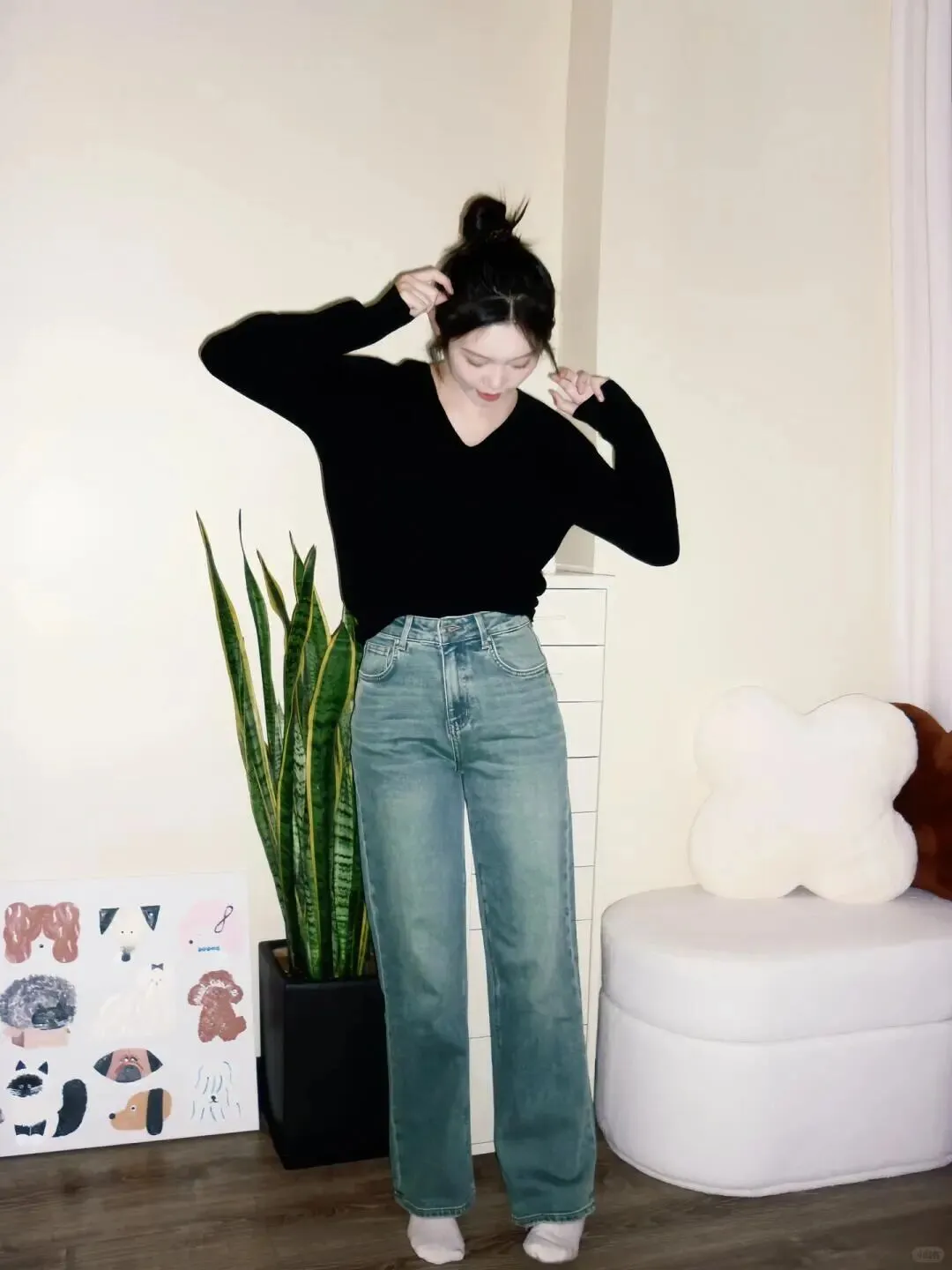 居家氛围感写真,牛仔裤这样穿,5 个姿势,慵懒随性又显高