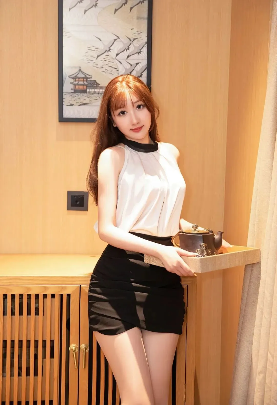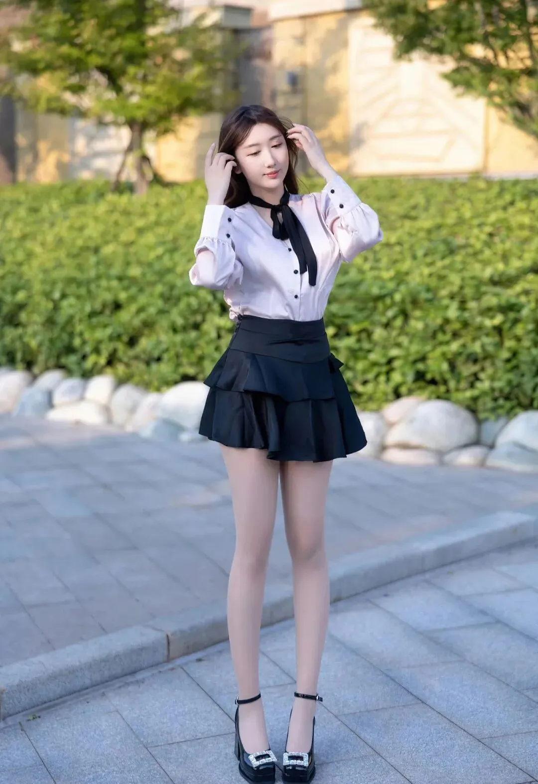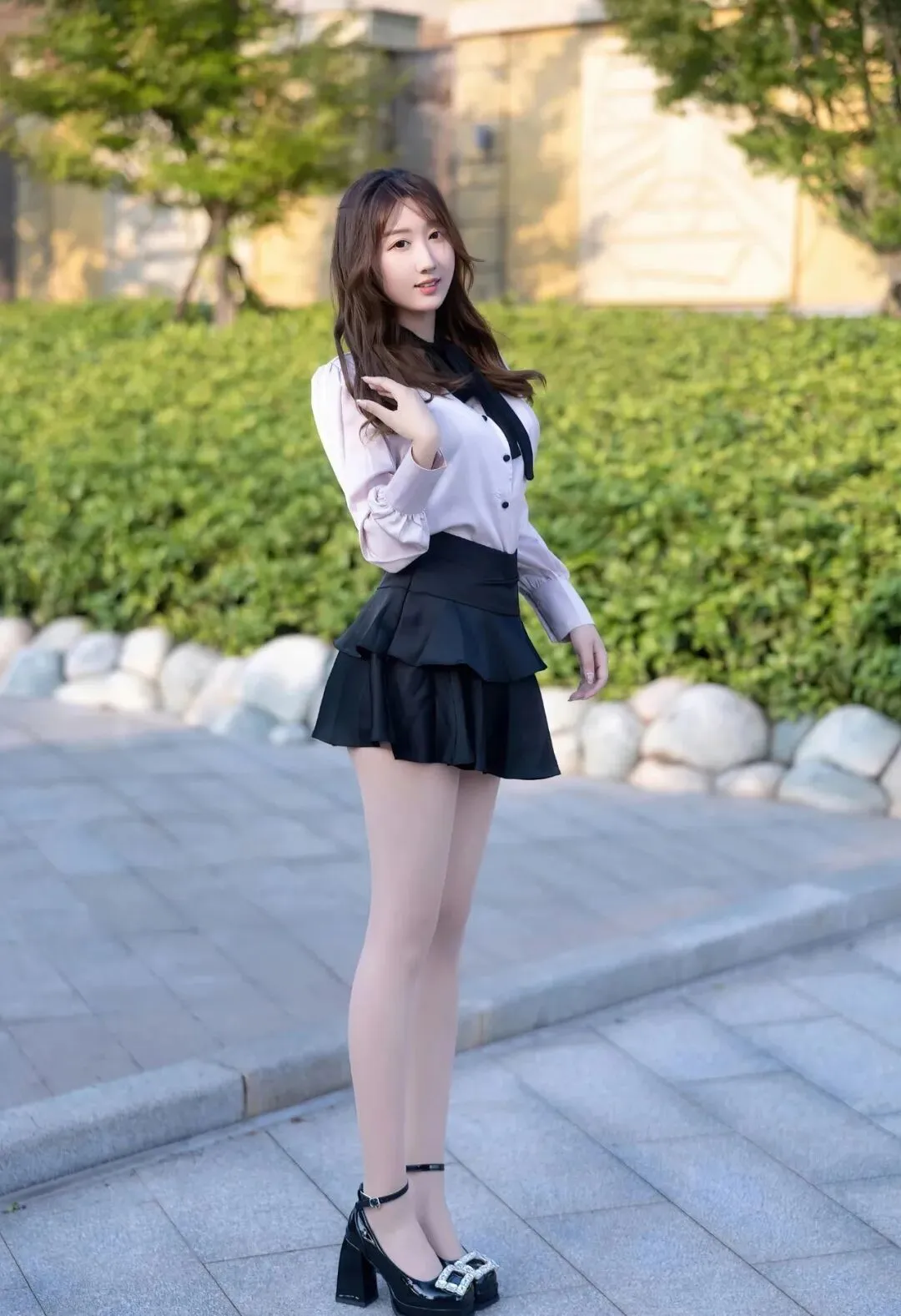 白色衬衫,搭配黑色百褶荷叶裙和肉色丝袜,发现一点,江真真很喜欢穿粗跟高跟鞋,个人感觉,不如细跟高跟鞋性感。