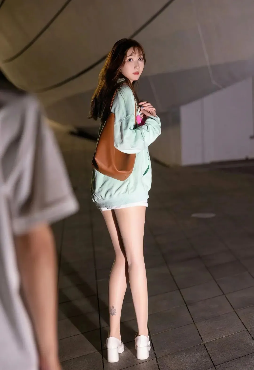 薄荷绿卫衣,搭配白色短裤和肉色丝袜,这一双大长腿,太吸睛了。