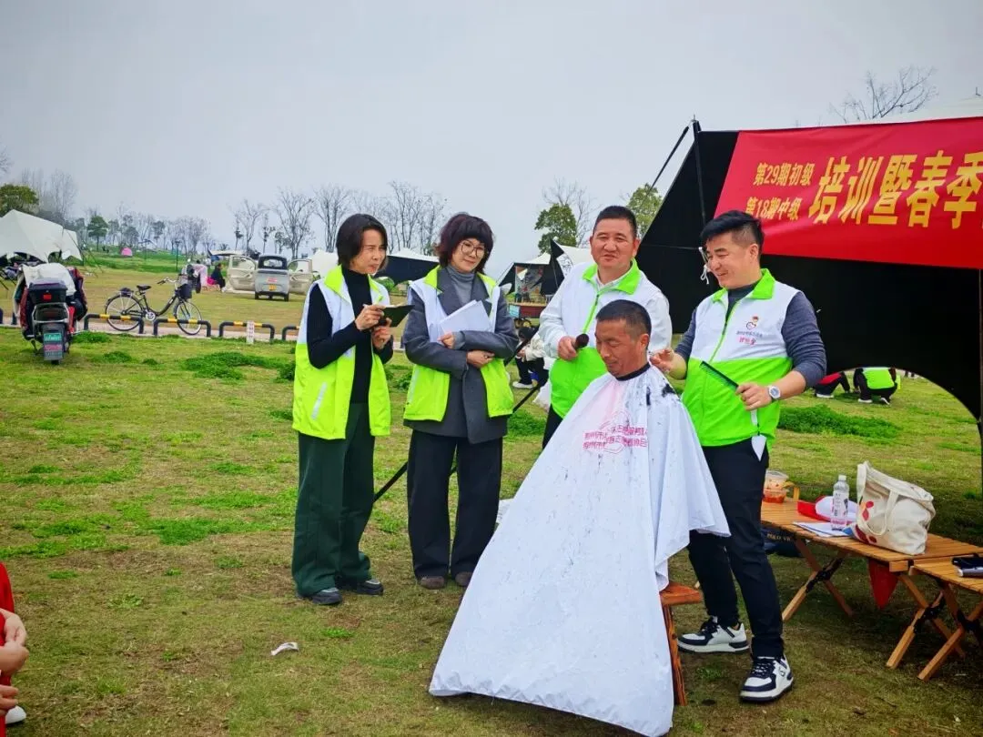 本次培训最暖心的一幕,莫过于协会会长、队长范于江主动请缨当“首席模特”。为了让志愿者们能在真人头上练出真手感、真本事,他二话不说披上理发围布,坐在临时搭建的理发台前,让参训的理发师志愿者轮流上手实操。