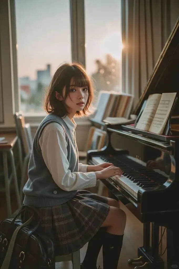 拍照最怕的就是光线平淡,整个人显得灰扑扑的。你们看那张在钢琴旁的照片,为什么那么有质感?就是因为抓住了窗边的侧逆光。下午四五点的阳光最柔和,透过窗户洒在身上,会给发丝镀上一层金边,皮肤也会显得通透白皙。室内拍照时,尽量靠近光源,让光打在你的侧脸,五官会瞬间立体起来。如果是晚上逛街,也不要错过路边的灯笼或者霓虹灯。像那张夜景照片,背景的暖色灯光虚化后,氛围感直接拉满。这时候把曝光稍微调低一点,人脸补一点光,就能拍出那种朦胧又温柔的故事感。记住,光线对了,照片就成功了一半,不要在大中午的顶光下硬拍,那是真的显黑又显胖。