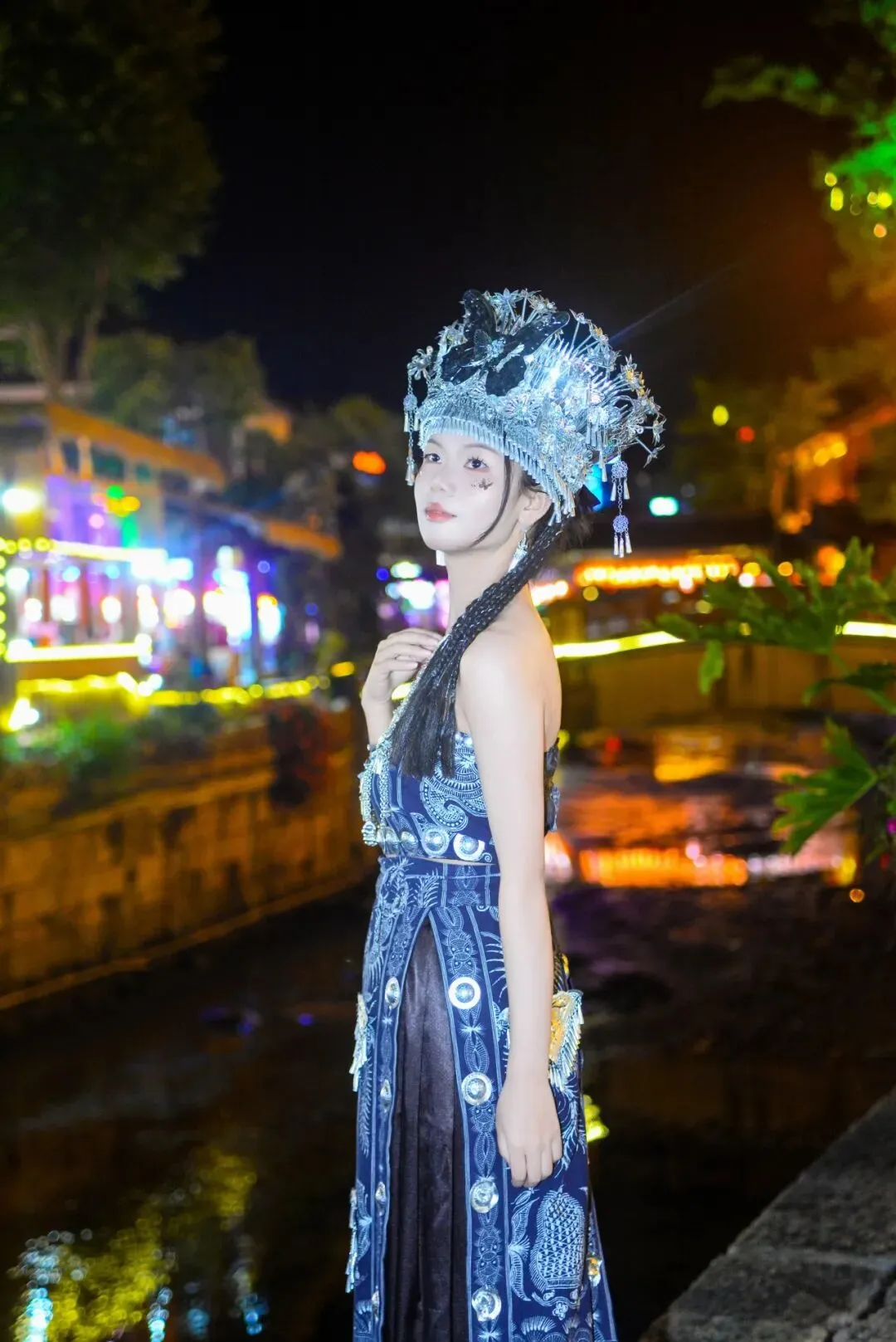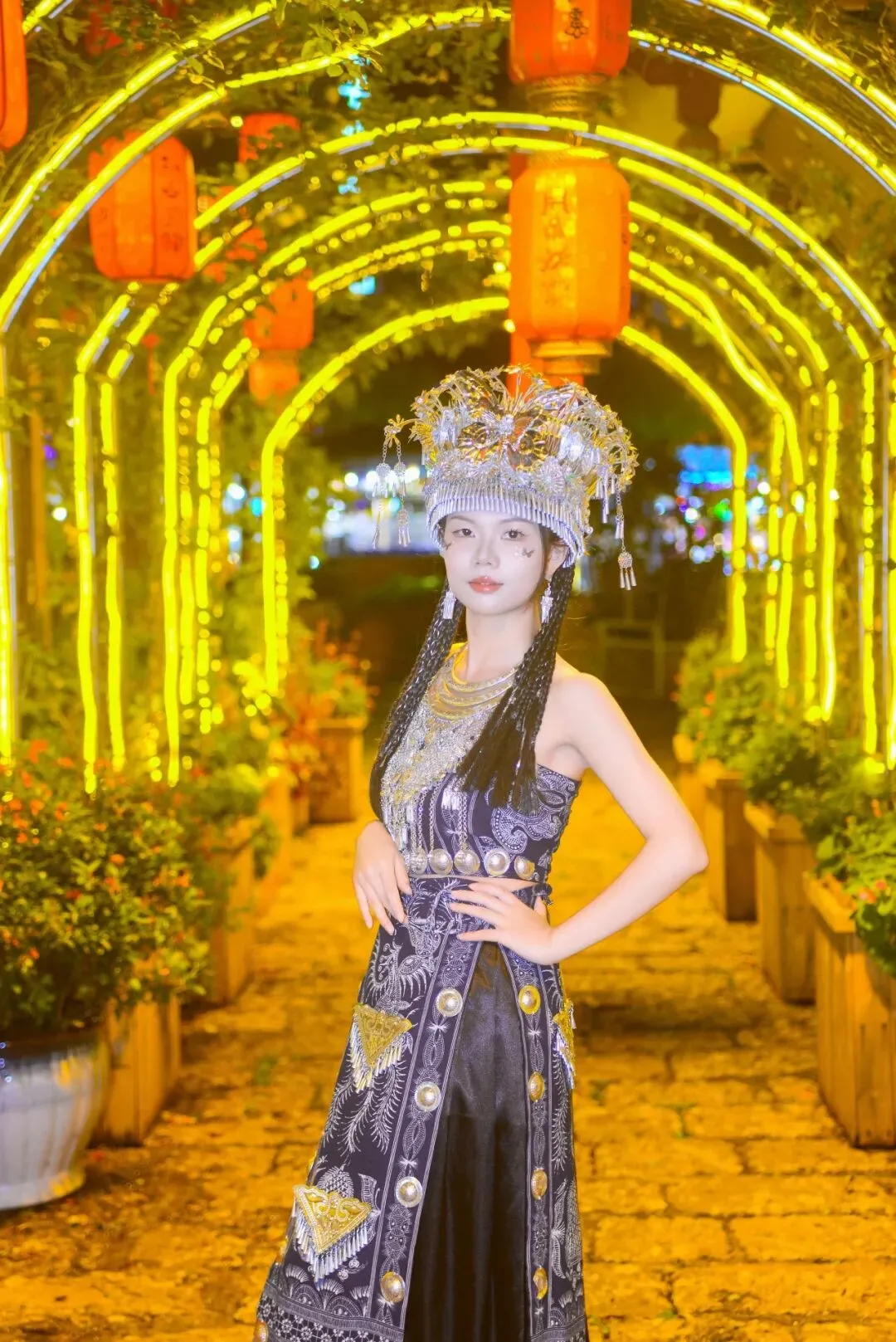 挑中了这套无袖改良版苗族服装,从照片看质量一般,尤其裙子,面料不好,不过胜在它是黑色,不太看得出来。一位小姐姐带我去到换衣间,很快换好,赶往打卡点。
