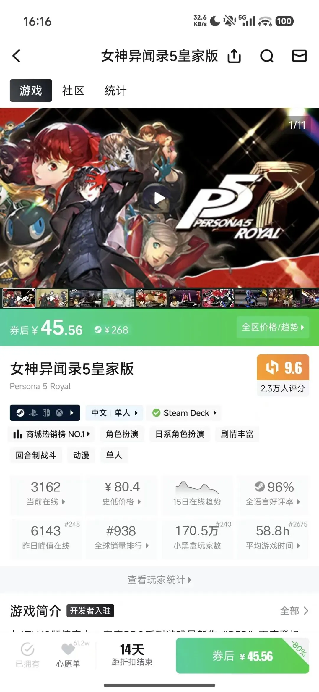 对于喜欢JRPG的玩家来说,最近有个好消息值得关注——被无数人称作“天下第一”的《女神异闻录5》,在小黑盒上迎来了2折优惠,还支持H币抵扣,最低35左右就可拿下。
