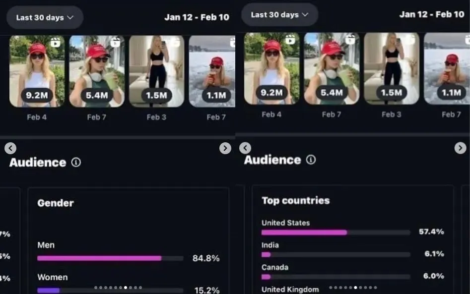 Emily Hart 账号后台粉丝数据,主要受众是美国男性