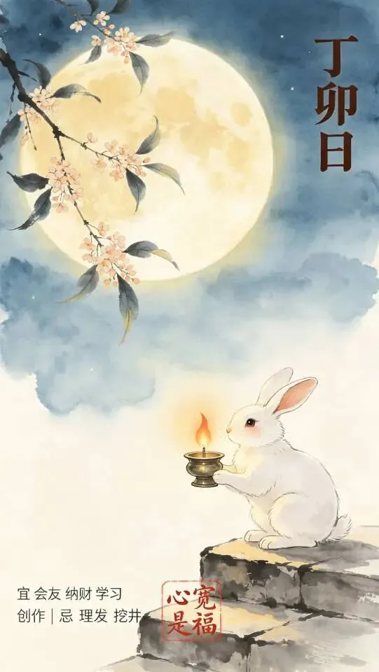 · 画面:浅墨夜空,朦胧圆月洒下暖黄光晕(呼应丁火);一只玉兔在石阶捧铜灯,灯芯燃橘红火苗;上方垂落淡色桂花枝增加层次。