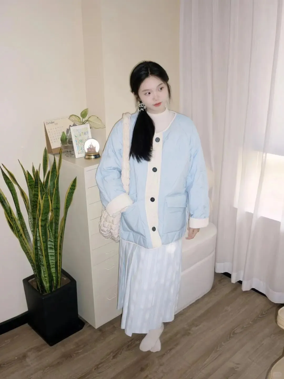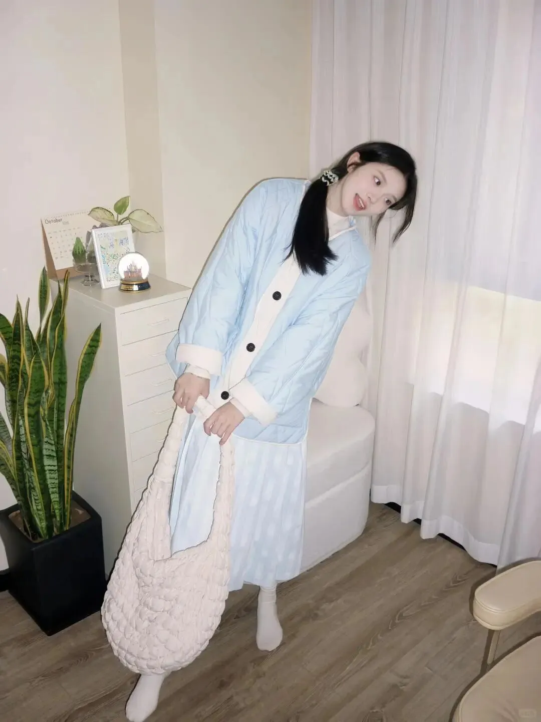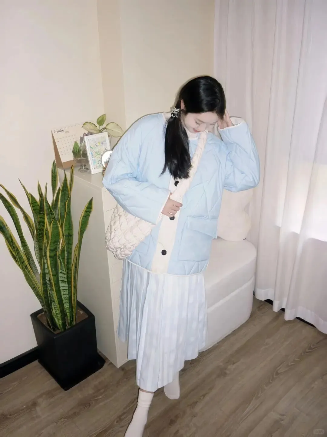 接下来是道具的运用,这点真的太关键了。很多人居家拍照会觉得手不知道往哪里放,垂在下面显得胳膊长,插兜又显得太随意,这时候一个合适的包包就能解决大问题。图中的白色毛绒包包不仅增加了造型的纹理感,让画面看起来更丰富,还能让手部动作变得自然。你可以拎着它,也可以像模特一样轻轻搭在身前,甚至抱在怀里。记住,道具自然互动,手部放松不要用力捏。手指要舒展,轻轻搭在包上即可,这样显得整个人非常松弛。如果手紧紧抓着包,肩膀就会不自觉耸起来,照片里就会显得很紧张,脖子也会变短。道具是为你服务的,不要让它成为负担,随意地拿着,反而更有生活气息。