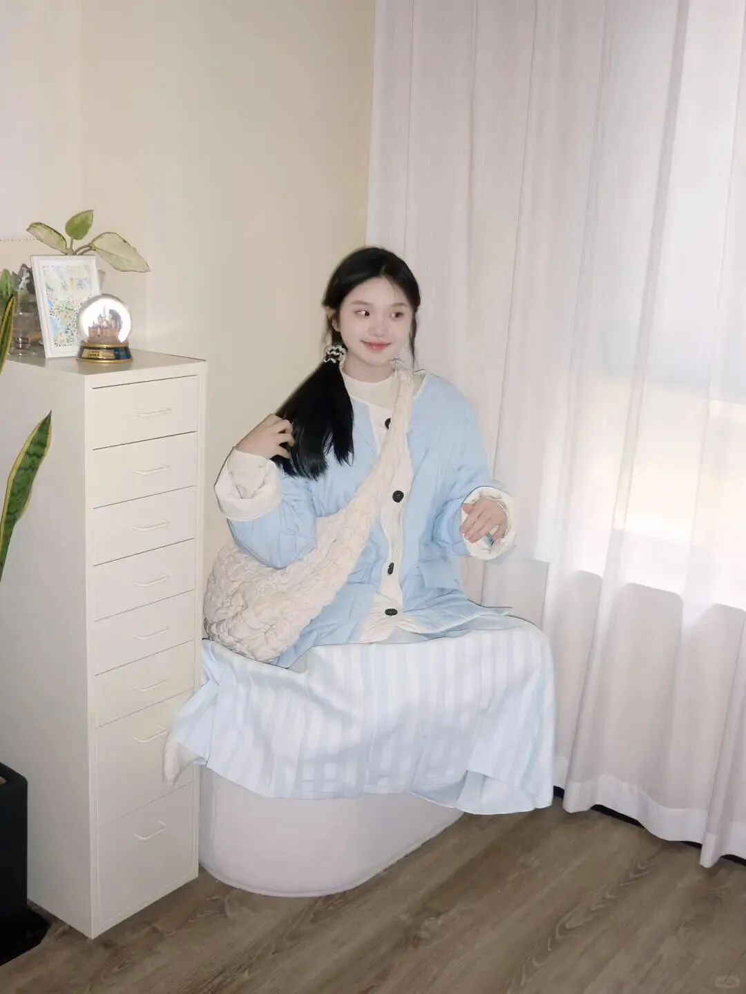 居家氛围感写真,试试这套蓝色穿搭,5 个动作轻松拍出春日温柔感