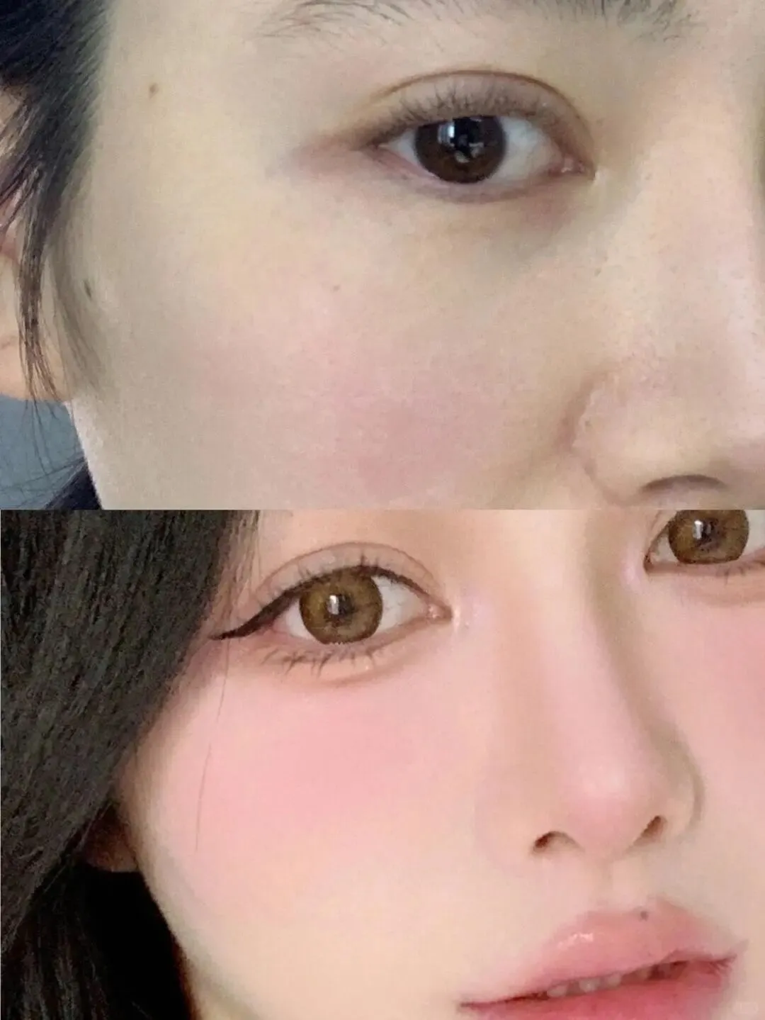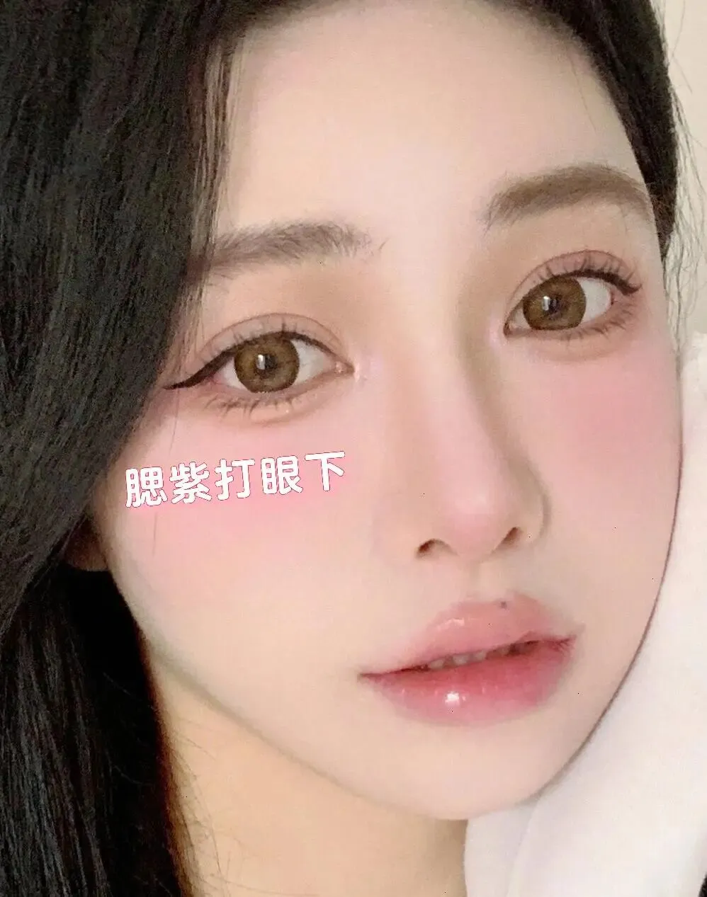 接下来是腮红和眼妆的打法,这是营造氛围感的关键。传统的腮红打在苹果肌虽然没错,但想要那种楚楚可怜的甜妹感, 一定要把腮紫或者粉色腮红打在眼下 。稍微大面积一点扫开,连接着眼影的部分,这样会让中庭看起来更短,整个人显得更幼态。这种画法就像刚哭过或者微醺的状态,非常能激发保护欲。搭配棕色的美瞳,眼神会更加柔和深邃,眼线不需要画得太粗,自然拉长的眼尾就能放大双眼, 眼神柔和才能拍出温柔的氛围 ,不要瞪眼,要想象自己在看喜欢的人,眼里要有光。