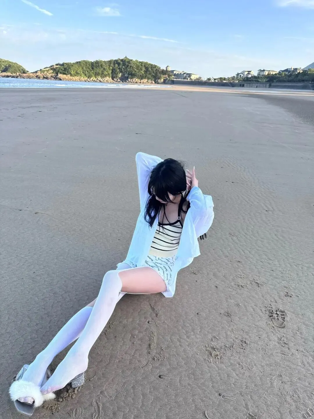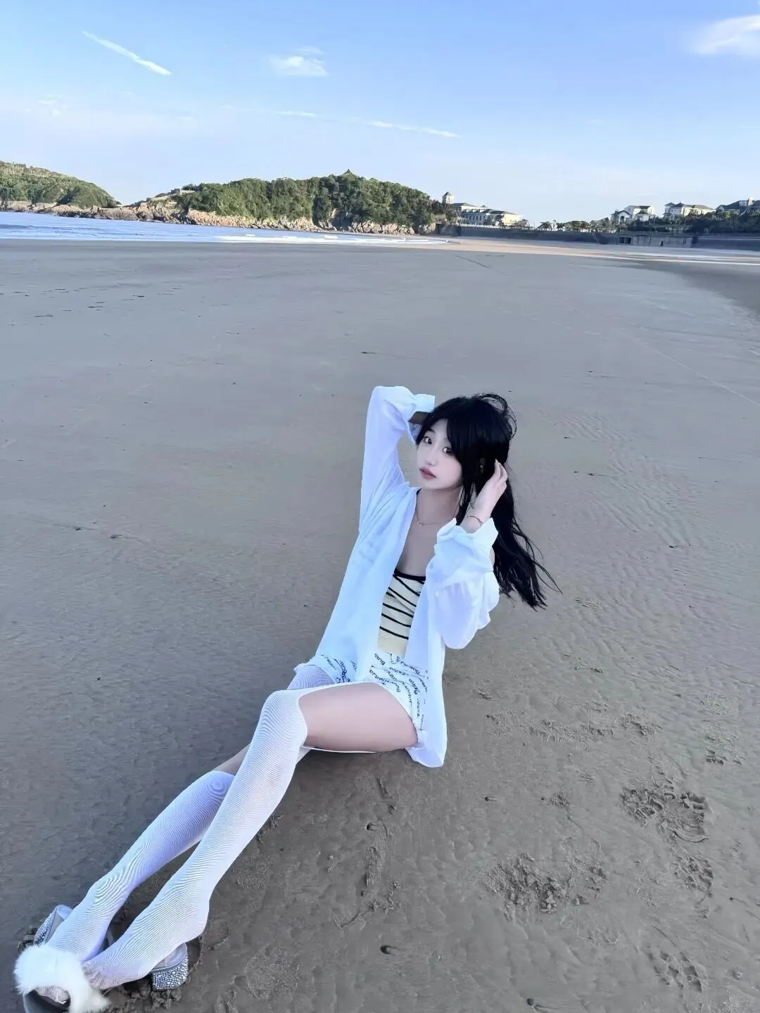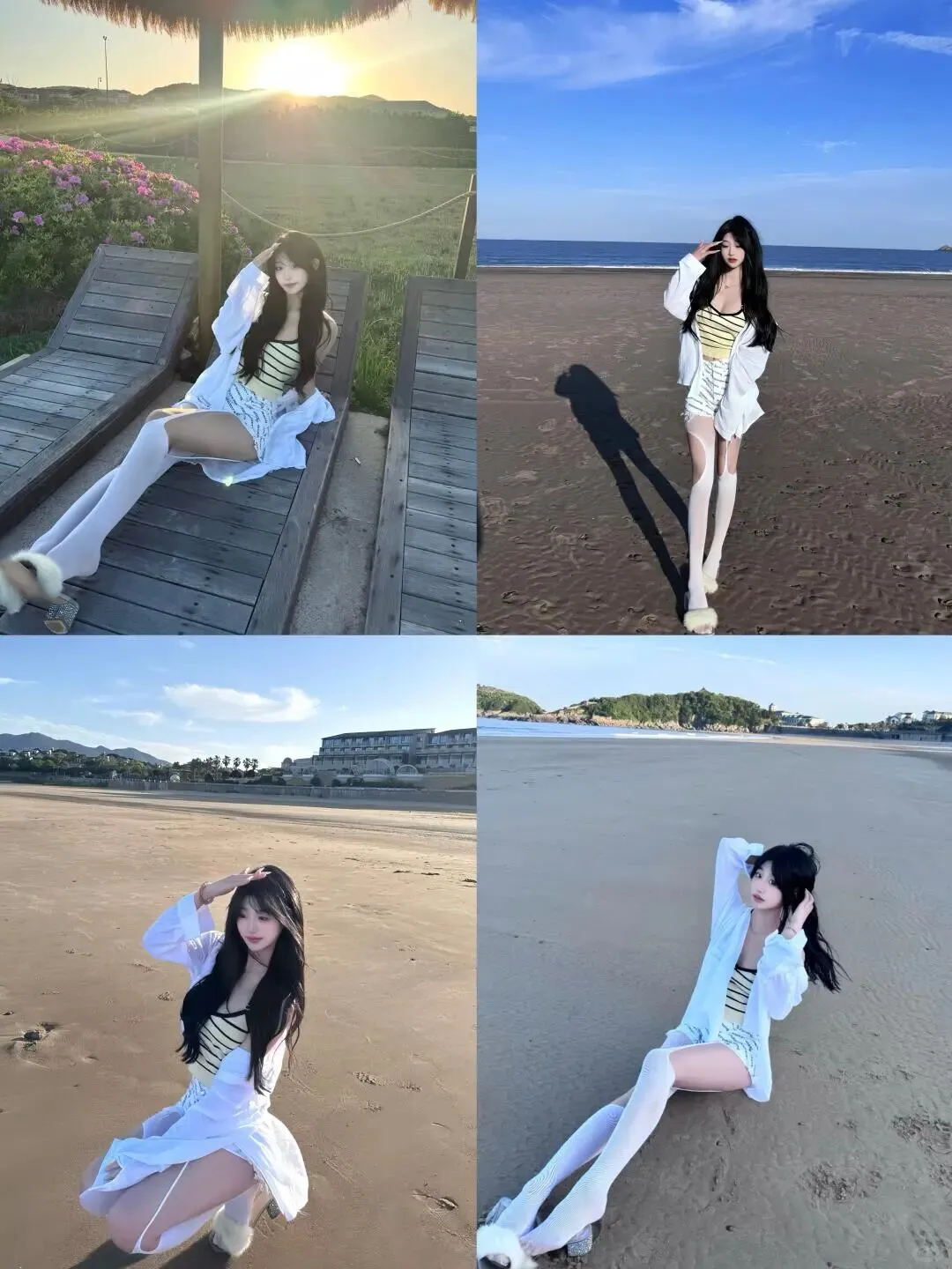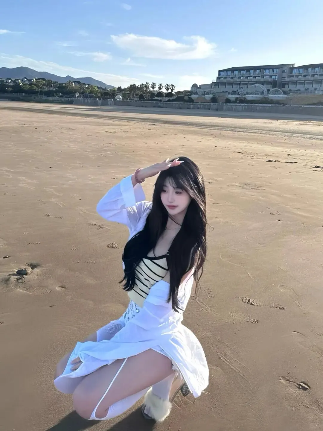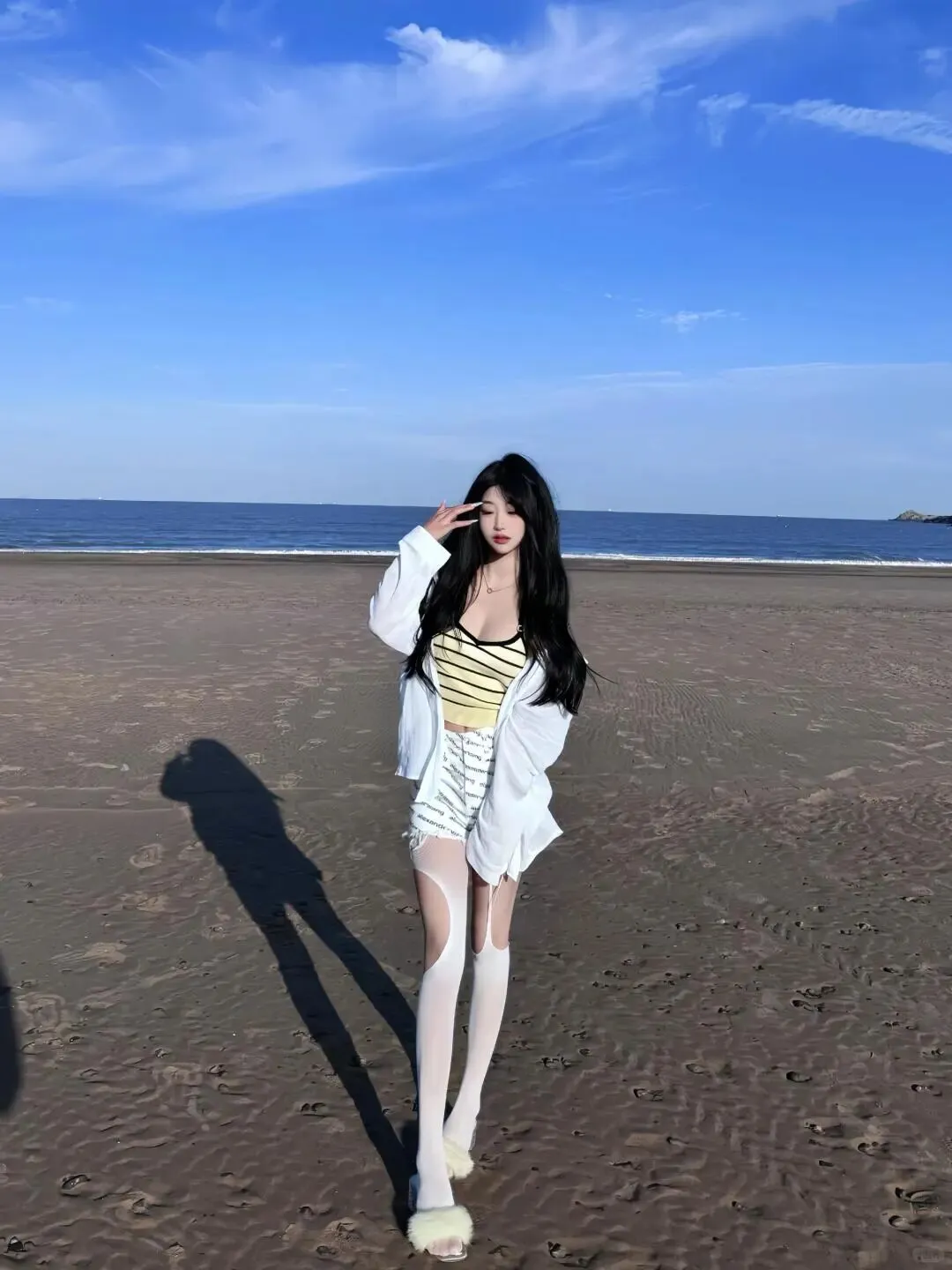 海边的背景通常是蓝色的大海和黄色的沙滩,所以穿搭颜色尽量简洁明亮。像图片中的模特一样,选择白色系的穿搭永远不会出错。一件宽松的白色衬衫,内搭黄黑条纹吊带,下身搭配白色短裤和白色长筒袜,整体色调统一又干净。白色在阳光下的反光板效果很好,能给脸部自然补光,显得皮肤白皙。宽松的衬衫既能防晒,又能营造出一种随性慵懒的氛围,走起路来衣角飞扬,动态感十足。鞋子可以选择带有毛绒装饰的拖鞋,增加一点可爱的元素,让整体造型不那么单调,同时也符合度假的轻松主题。
