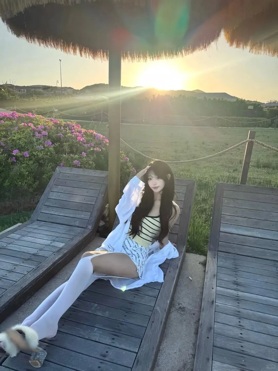 海边通常会有遮阳伞、躺椅等设施,不要浪费这些天然道具。坐在木质躺椅上,身体放松地靠下去,一只手搭在额头,另一只手自然垂放,背景是远处的山峦和落日,画面层次非常丰富。利用遮阳伞的边缘作为前景,可以增加画面的层次感,还能遮挡部分强光。如果有草帽或者透明雨伞,也可以拿在手里把玩。道具的作用是让手有事可做,避免尴尬。同时,道具的颜色最好与穿搭呼应,比如木色的躺椅搭配白色穿搭,显得很有质感,营造出一种高级的度假风。