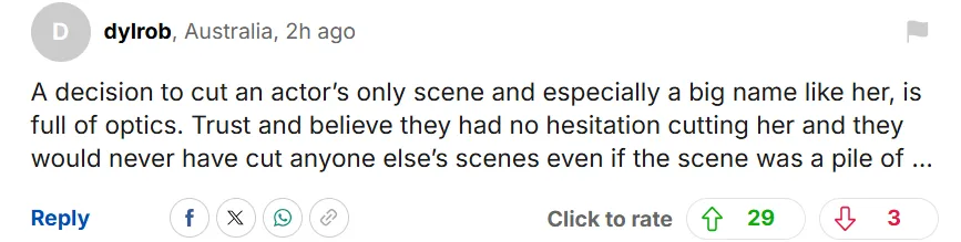 “删掉一位演员的戏份,更何况是她这样的知名艺人,剧组做出这样的决定就已经做好被骂的打算。所以你完全可以确信,片方毫不犹豫、下定决心要删她的戏。但换作其他任何演员,哪怕对方拍的再烂,片方也绝对不会舍得删减。”