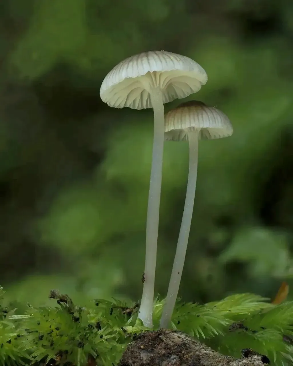 双菌清姿映浅苔,伞纹如缕织银白。