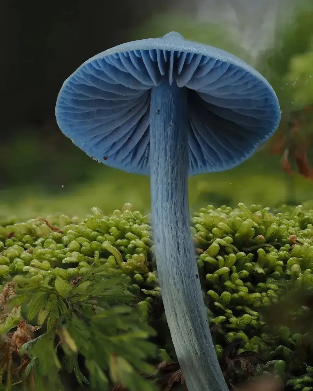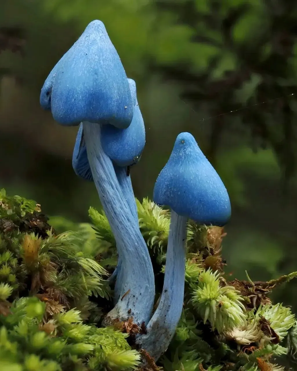 幽蓝凝露立苔痕,小伞尖尖不染尘。