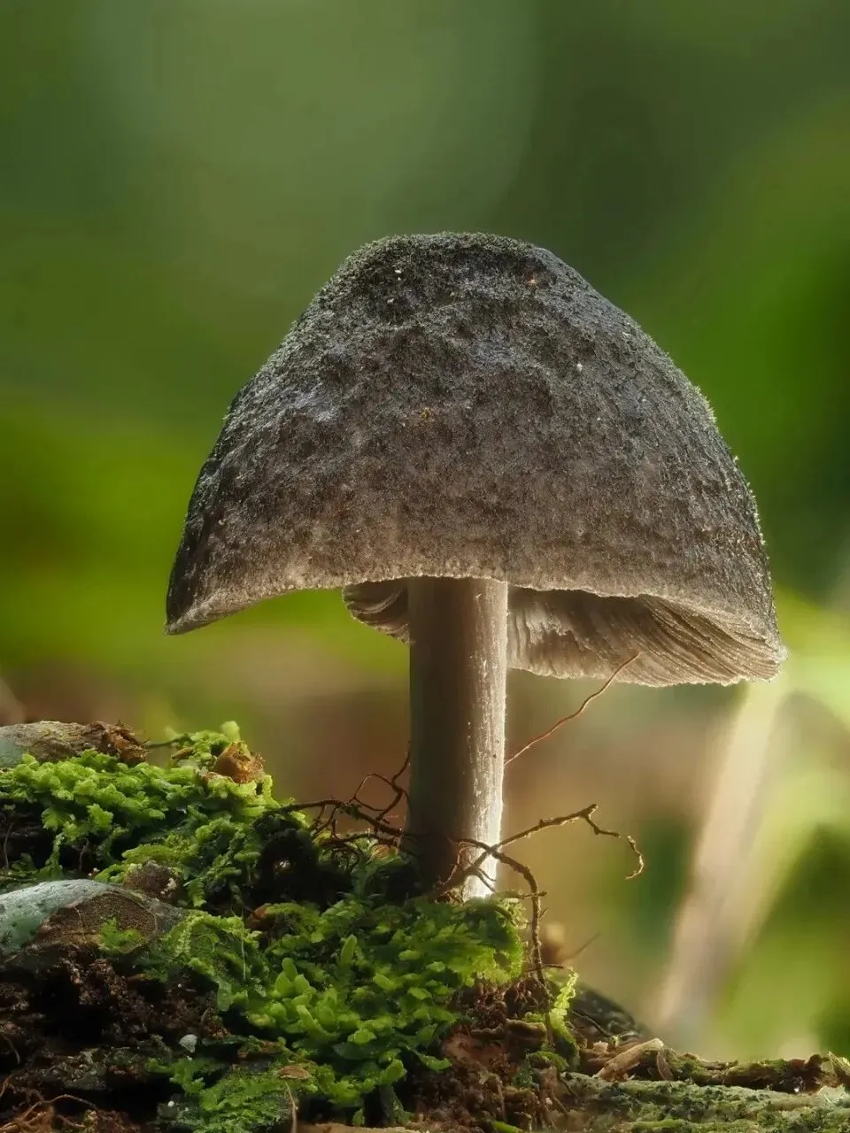 褐伞轻擎倚藓苔,纤茎弱影破苍埃。