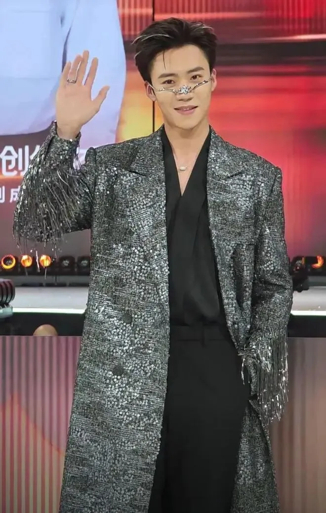 内里一身黑,外搭一件银色系的长款风衣,发型和脸上的配饰都很有个性。而他的五官本就立体精致,亮相的那一刻,镜头都变得清晰了。