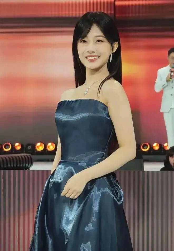 侯呈玥的这套礼服选的倒是更加得体,深蓝色的抹胸裙装,材质还很有流光溢彩的效果。