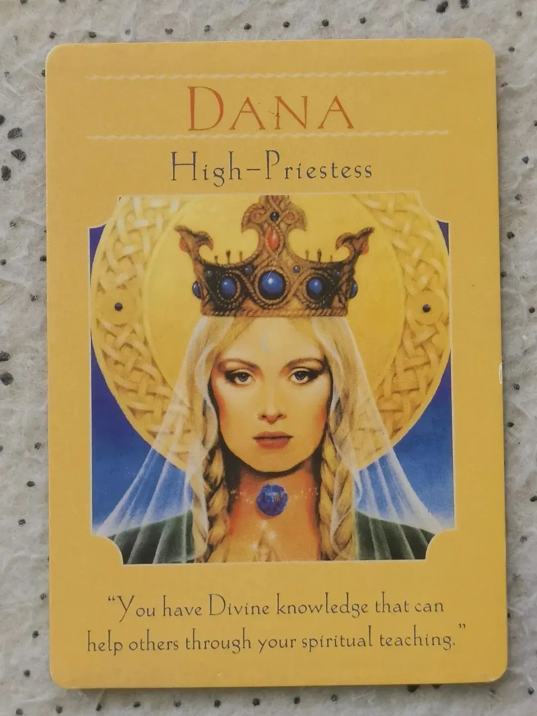 回看这张牌卡,女神眼神庄重,眉间有轮月牙,头戴皇冠,白纱披在头上,喉咙处有一颗蓝色的宝石,扎了两个金色的辫子,穿着绿色的衣服,黄色和蓝色的背景更增加了女神的神圣状态。