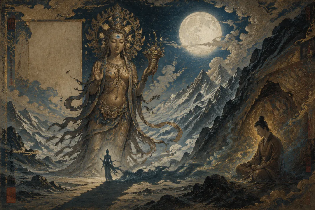 无相怒极,诵《金光神咒》,周身金光大盛。那女子站在金光中纹丝不动。光芒穿过她的身体,像穿过透明的琉璃。那第三只眼将无相周身的金光反射回去,映在墙壁上、地上——然后无相低头,看见了自己的影子。