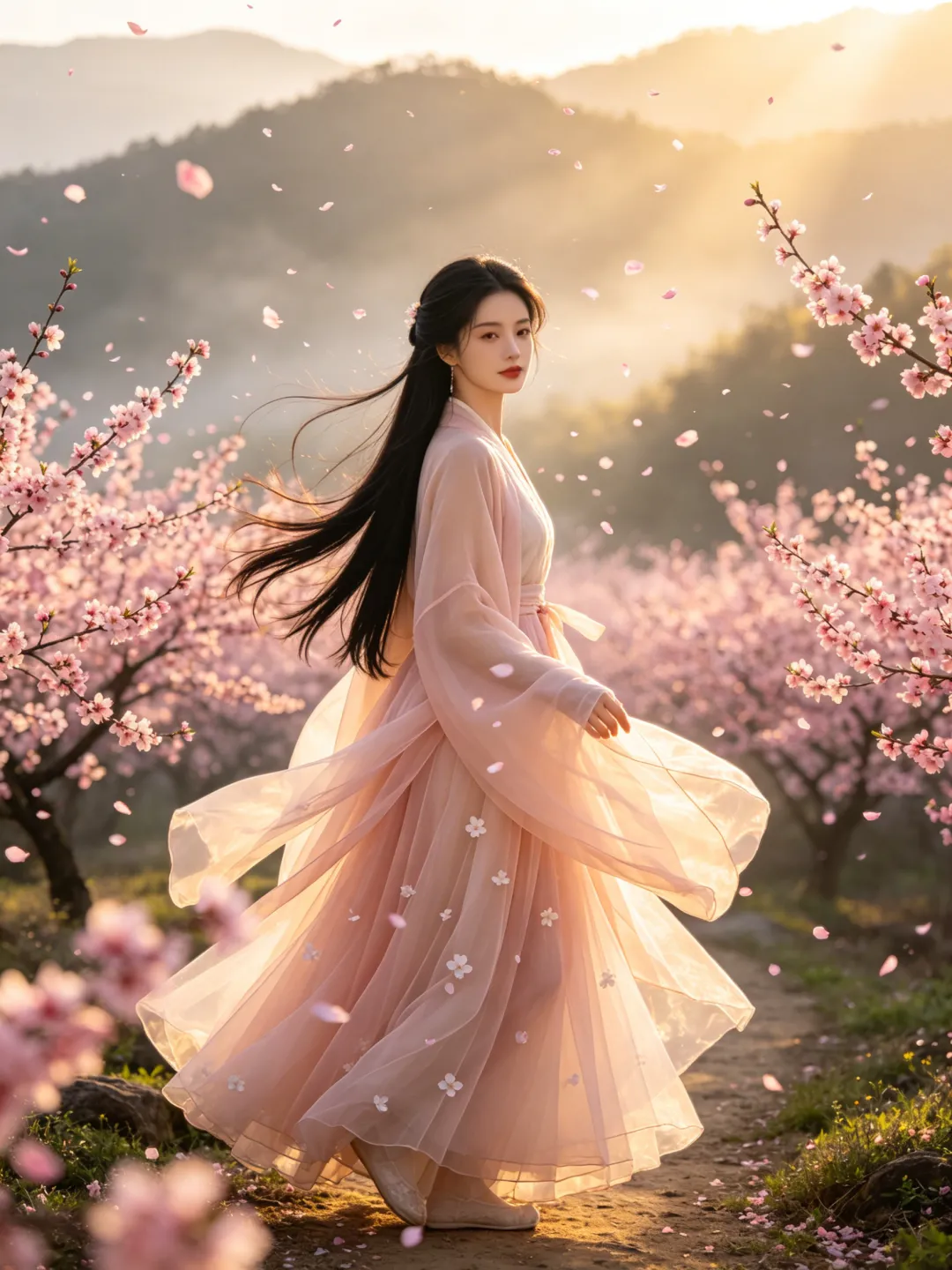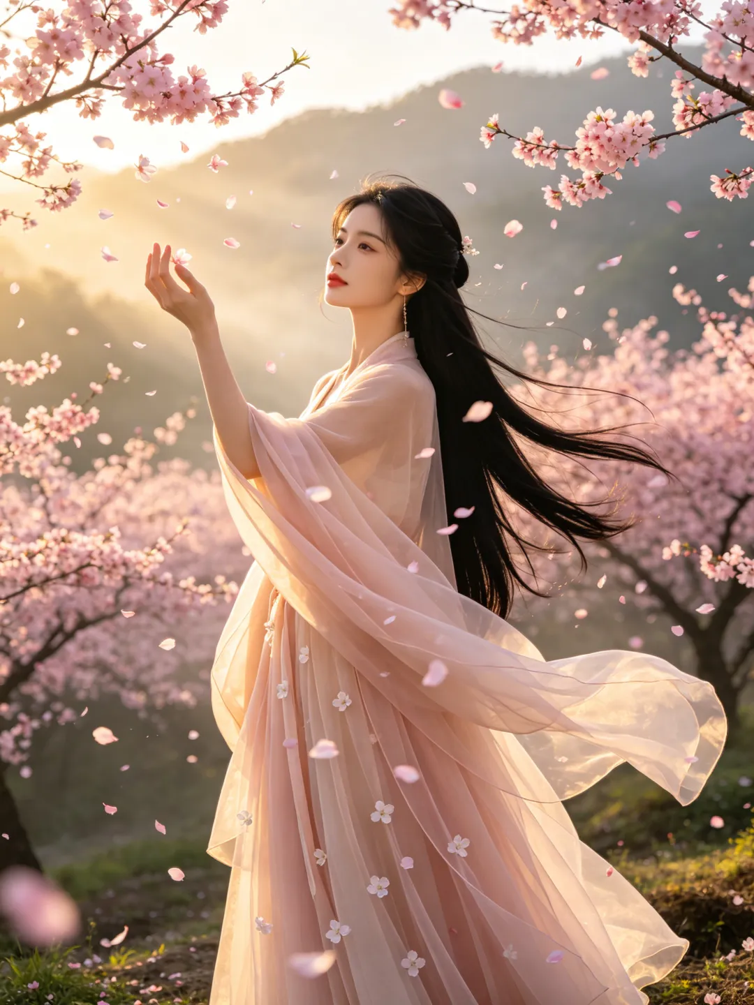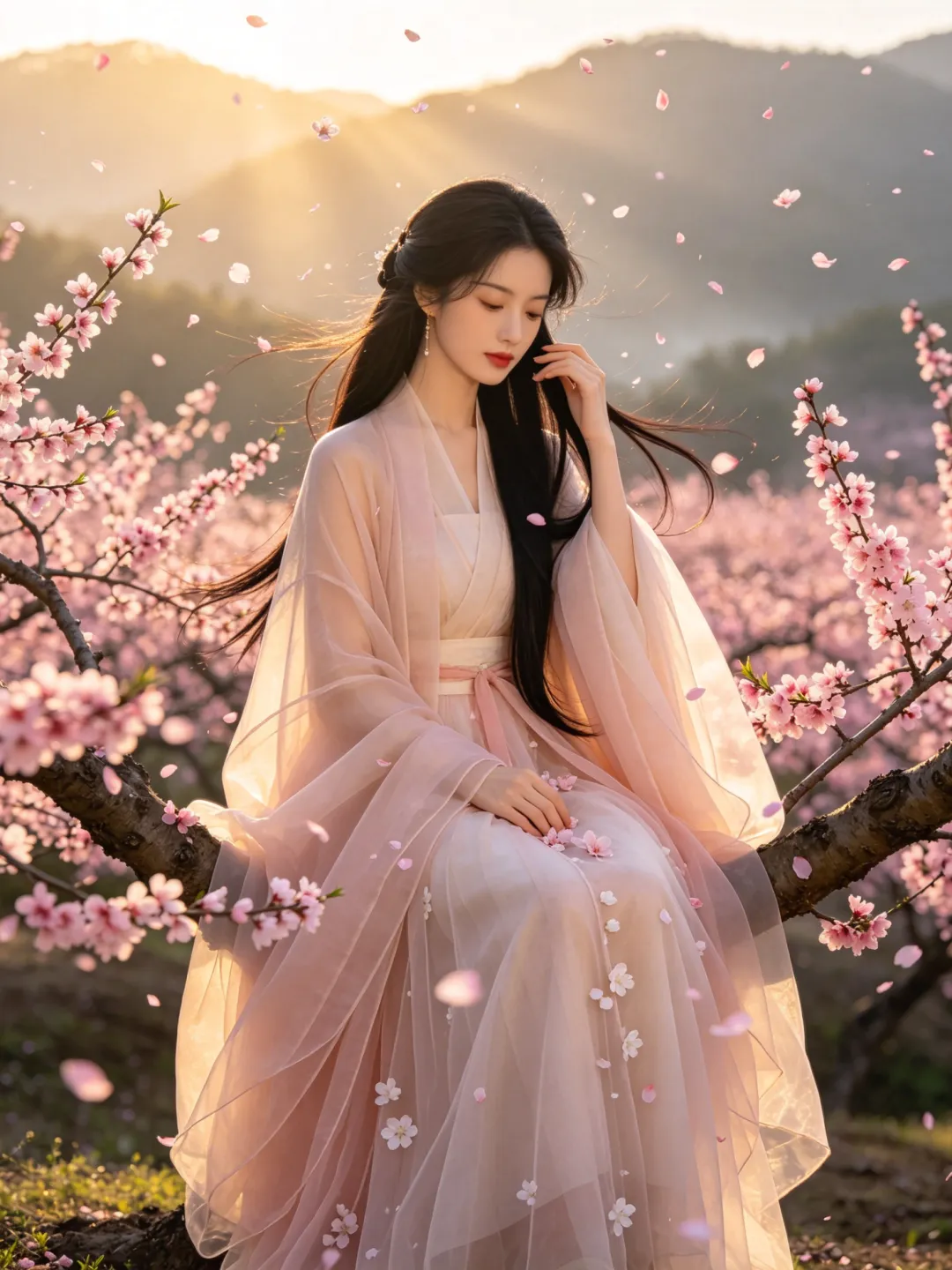 提示词:比例 3:4,8K 超清,电影级景深虚化,清晨山间薄雾朦胧,柔和金色丁达尔侧逆光,漫山遍野粉色桃花林仙境,漫天桃花花瓣随风飘落飞舞,唯美仙侠诗意古风意境,极致细腻皮肤,仙气柔光氛围感拉满,古风写真实景质感 22 岁东亚清冷绝色美人,精致鹅蛋脸,温柔淡漠清冷五官,淡妆红唇,乌黑柔顺长直发,简约古风半披发,身穿浅杏粉色飘逸透视轻纱唐风汉服大袖衫,多层仙气薄纱裙摆,轻盈通透,裙身点缀白色小花 多动作随机切换:斜躺桃花树枝桠倚靠饮酒 / 坐在花枝上垂眸抚发 / 站立林中抬手接落花 / 侧身漫步桃花小径 / 倚树闭目浅笑 / 抬手轻捻桃花 乌黑长发随风飘逸飞扬,全身环绕盛放桃花,梦幻朦胧仙气,户外自然实景,唯美高级古风大片,无畸形无崩坏