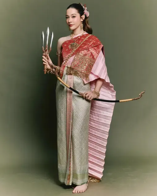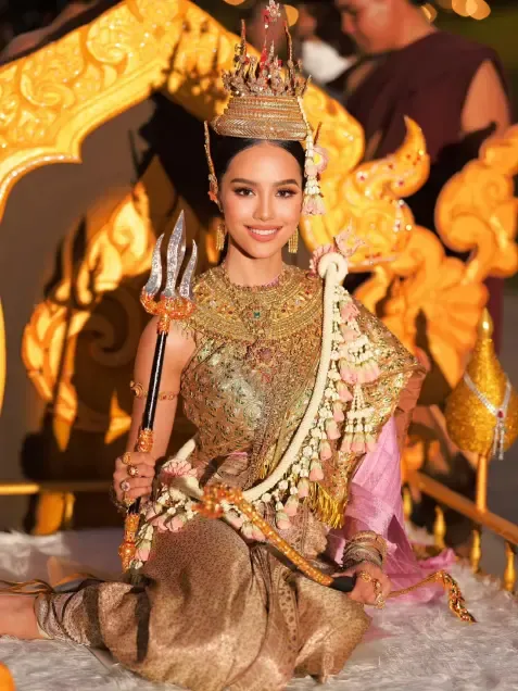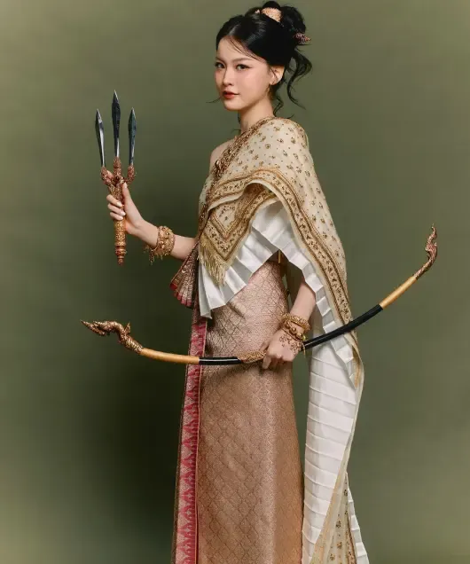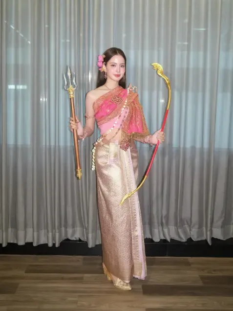 混血女演员Gina Yeena,穿起泰装来有着独特的韵味。她化身宋干女神时,随身携带拉克萨德维女神的专属法器,眉眼间既有女性的美丽端庄,又透着不容亵渎的威严,浑身充满力量感,完美还原了拉克萨德维女神的核心气质。