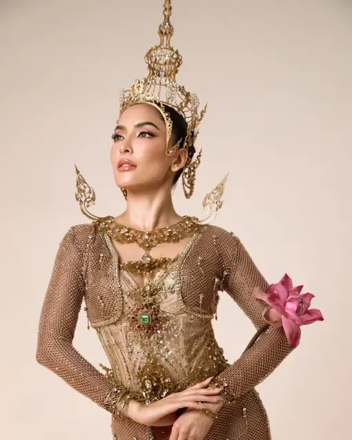 Pinky以传承泰国传统为初心,化身拉克萨德维女神,身着耀眼的金色改良泰装,搭配粉色莲花配饰,既有泰式美学的凌厉感,又不失女性的柔美,一举一动都气场全开,美得动人心魄,自带强大的女神气场。