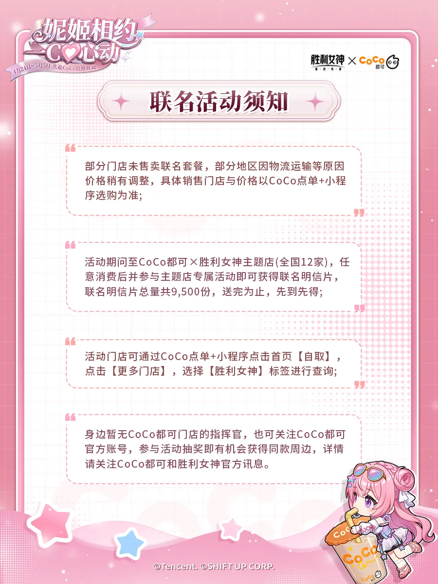 2、活动期间至CoCo都可X胜利女神主题店(全国12家),任意消费后并参与主题店专属活动即可获得联名明信片,联名明信片总量共9500份,送完为止,先到先得;
