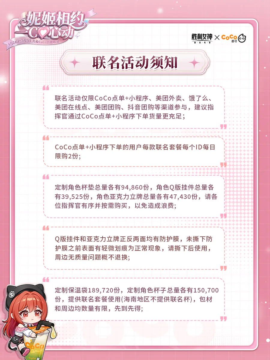 5、联名活动仅限CoCo点单+小程序、美团外卖、饿了么、美团在线点、美团团购、抖音团购等渠道参与,建议指挥官通过CoCo点单+小程序下单货量更充足;