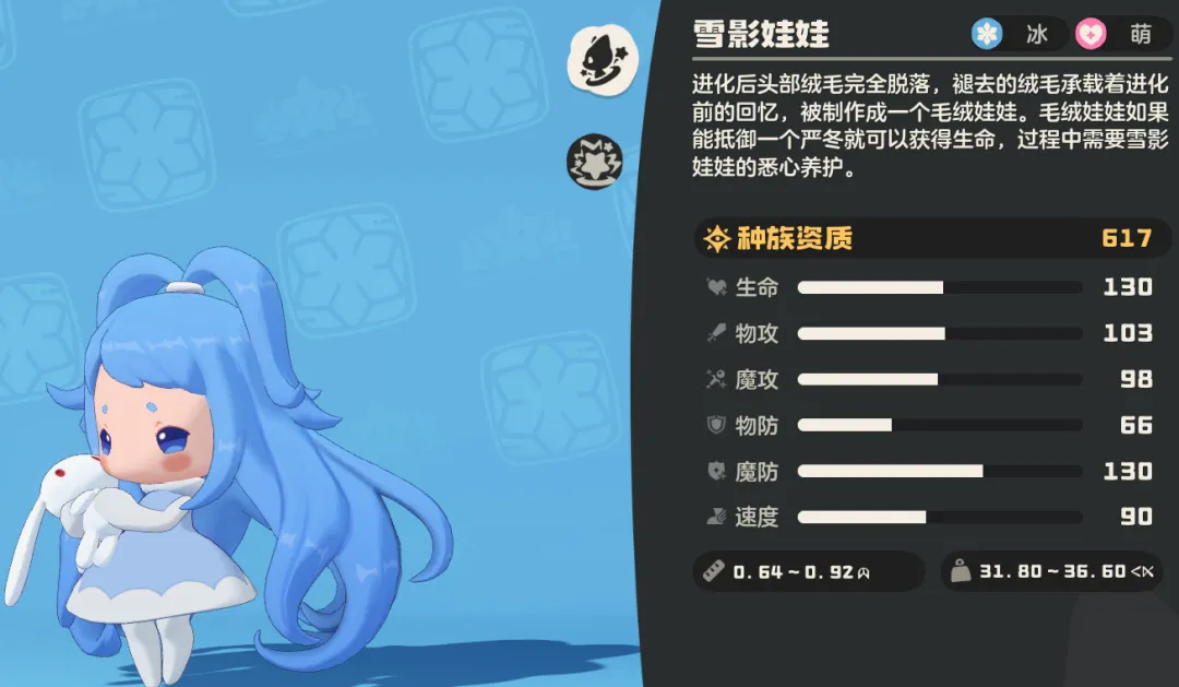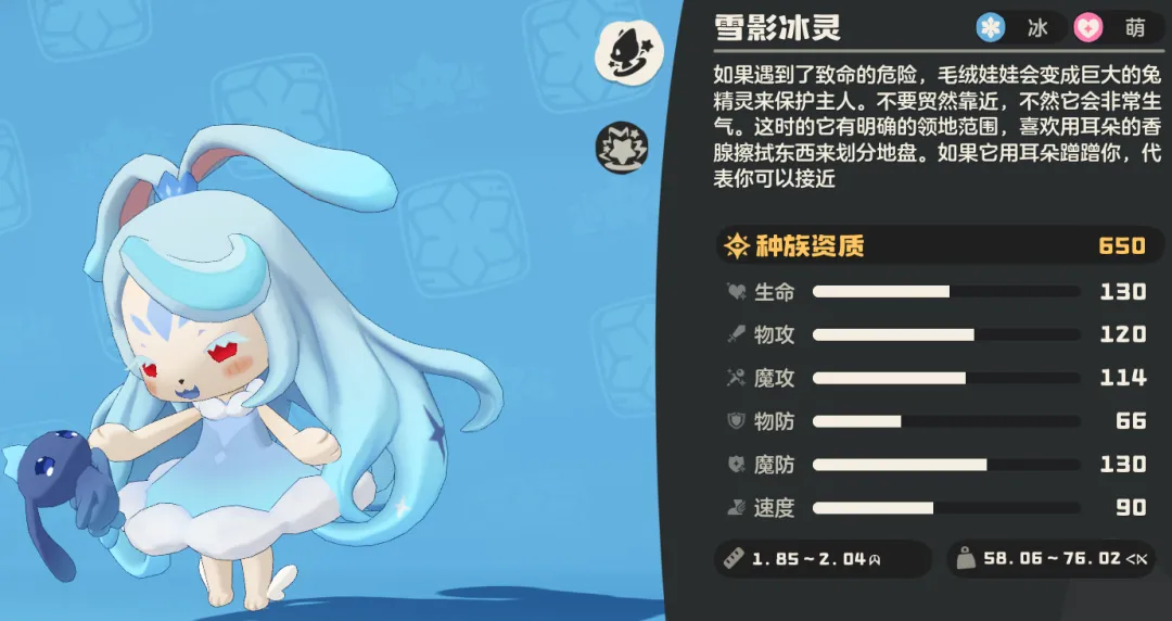 属性:冰 + 萌(抵抗水、光、冰、虫系,被火、土、毒、恶、机械系克制)