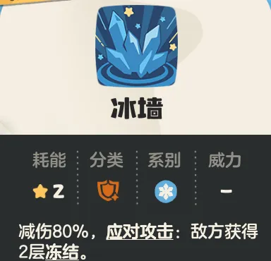 冰墙(核心):防御,2能耗,减伤80%,应对攻击使敌方获得两层冻结;由于特性的存在,敌方同时获得能耗+1