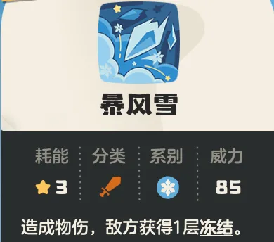 暴风雪(核心):冰系物理,3能耗,85威力,使敌方获得1层冻结(能耗+1)