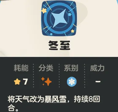 冬至:8能耗,天气改为暴风雪,双方每回合获得两层冻结(由天气引起的冻结不会触发特性的能耗增加效果)