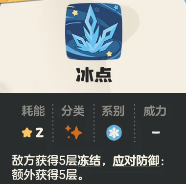冰点:2能耗,敌方获得5层冻结,应对防御额外获得5层