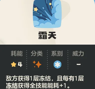 霜天:4能耗,敌方获得一层冻结,且每有一层冻结获得全技能能耗+1;适合敌方高能耗开启