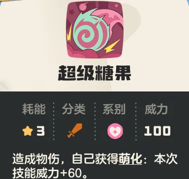 超级糖果:萌系物理,3能耗,威力100,自己获得萌化,此次威力+60(萌化只影响种族值,不影响特性)