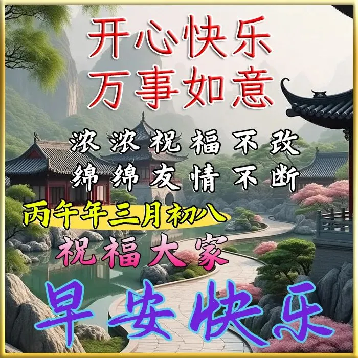 在这繁华似锦的空间里,今生的祝福是一朵芬芳的勿忘我,收集今生心中的每一丝真诚、每一个愿望、每一份祝福,描绘今生心中每一个细节、每一份感动、每一个期盼,寄予对好朋友深切的祝愿。早上好,祝我的好朋友笑口常开、好运常在、快乐永久、幸福永久!