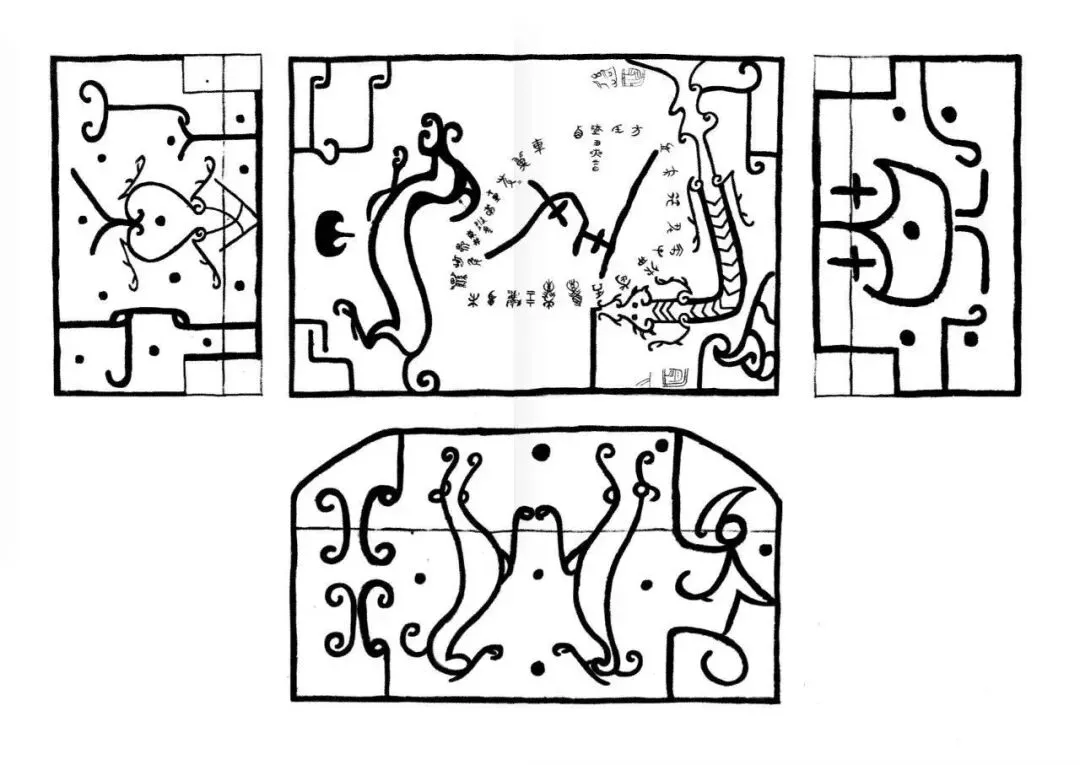 1、上图是该漆箱的顶面、东、西、北面的图案,南面的图案一直没有公布(冯时所言),广百认为被隐藏的南面的图案很可能是象征秋的大神蓐收,之所以不敢公布是因为该图形的辨识度非常高,一眼就能看出是其它文明的标志性神灵。