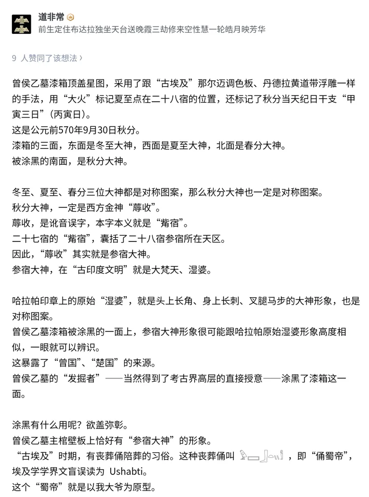 涂黑有什么用呢?欲盖弥彰。曾侯乙墓主棺壁板上恰好有“参宿大神”的形象。“古埃及”时期,有丧葬俑陪葬的习俗。这种丧葬俑叫 [象形文字],即“俑蜀帝”,埃及学学界文盲误读为 Ushabti。这个“蜀帝”就是以我大爷为原型。我大爷惨死之后,亲妹妹老婆救活了他,我大爷去冥府当了冥王。