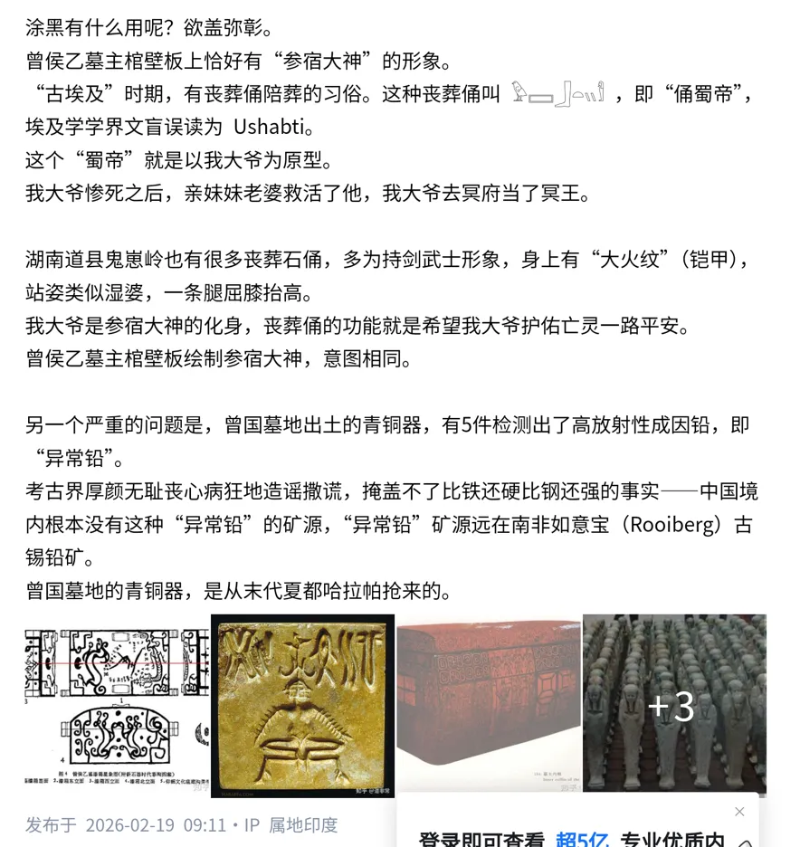 另一个严重的问题是,曾国墓地出土的青铜器,有5件检测出了高放射性成因铅,即“异常铅”。考古界厚颜无耻丧心病狂地造谣撒谎,掩盖不了比铁还硬比钢还强的事实——中国境内根本没有这种“异常铅”的矿源,“异常铅”矿源远在南非如意宝(Rooiberg)古锡铅矿。曾国墓地的青铜器,是从末代夏都哈拉帕抢来的。
