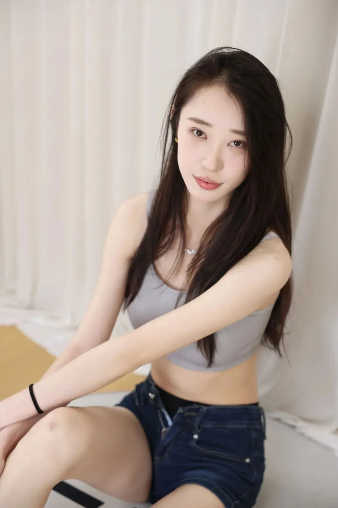 短款背心勾勒出舒展的腰线,深色牛仔短裤自带随性氛围,光脚的细节又添了几分慵懒感,整套穿搭清爽又上镜,是夏日少女写真的绝佳模板。